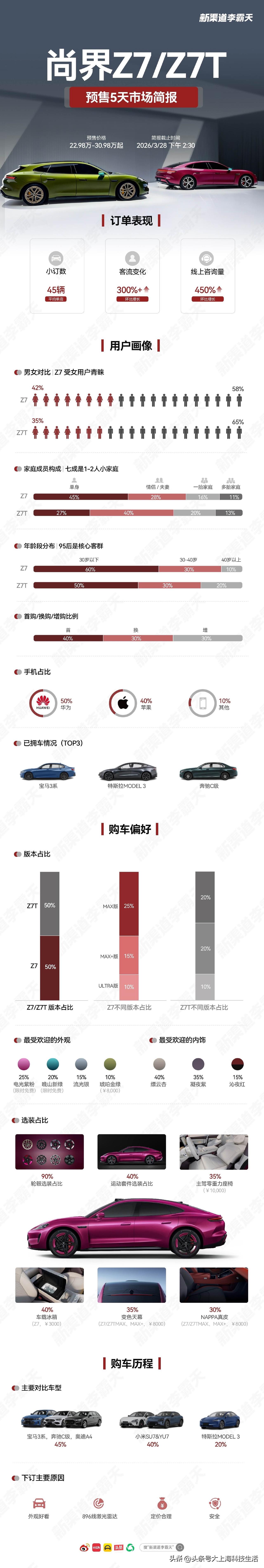 尚界Z7/Z7T预售5天的市场简报,有几个比较重要的数据值得留意: 1,小米SU7 最强对手终于来了,有近一半的消费者会在Z7和SU7之间做选择,对于消费者来说,多了一个选择是好事,对于SU7来说,这不是什么好消息 2,平均单店小订45辆,客流变化环比增长300%。也就是说短短5天进店看车的人数翻了3倍(不包含周末,数据统计截止到3月28日周六下午两点半)。客流大幅增长带动订单,说明产品、定价都比较符合终端预期,这也恰好对应了外观、896激光雷达、定价合理、安全是用户下定主要原因。 3,用户画像中,1-2人小家庭占据7成,95后占据一半以上,首/换/增比例相对均衡。这组数据说明尚界Z7/Z7T锁定年轻群体的用户定位精准。相比于大家庭,小家庭的购车决策链路往往更短,更快,也更具有自主性,所以新车上市后,小订转大定的转化比,估计不低。 另外,首/换/增比例是4:3:3,需求结构比较均衡,首购、增购以及换购之间口碑相互带动,尚界Z7/Z7T今后的用户客群只会越来越宽。 4 ,没想到的是,用户最多对比的竟然是BBA的「34C」。这就有意思了,且不说特斯拉Model 3和Su7,目前「34C」一个月在国内市场的累计销量也有2-3万台,而尚界Z7/Z7T不管是设计还是配置,不管是智能还是驾控,优势都是很明显的。 并且,用户对比最多的是BBA,这也说明尚界的品牌形象也逐渐立起来了。