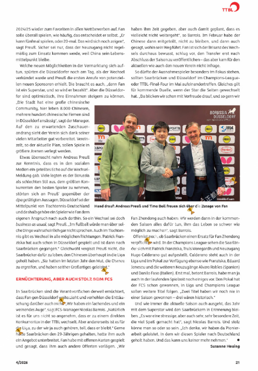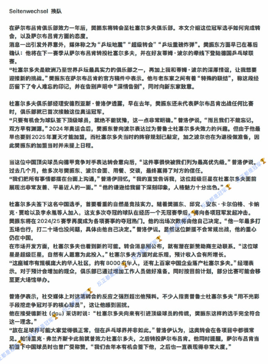 德国乒乓球杂志报道樊振东 德国专业乒乓球杂志《tischtennis》 4月刊重点报道樊振东转会内容。分别介绍了杜塞尔多夫和萨尔布吕肯经理对此的表态。 杜塞尔多夫经理普洛伊透露,早在去年,樊振东还未代表萨尔布吕肯出战任何比赛时,俱乐部就已首次接触这位奥运冠军。而且双方早有渊源。2024年奥运会后,樊振东曾向波尔表达过为杜塞尔多夫效力的兴趣。 “我们给了樊振东时间,也考虑过他可能离队的情况。”萨尔布吕肯经理巴鲁瓦说。今年2月他与中方沟通时,对方最初表示愿意留队,随后又告知“樊振东的想法有所改变”。他强调,整个过程始终透明,尽管转会到赛季末才正式公布,但并未影响当前赛季的备战与新援引进。