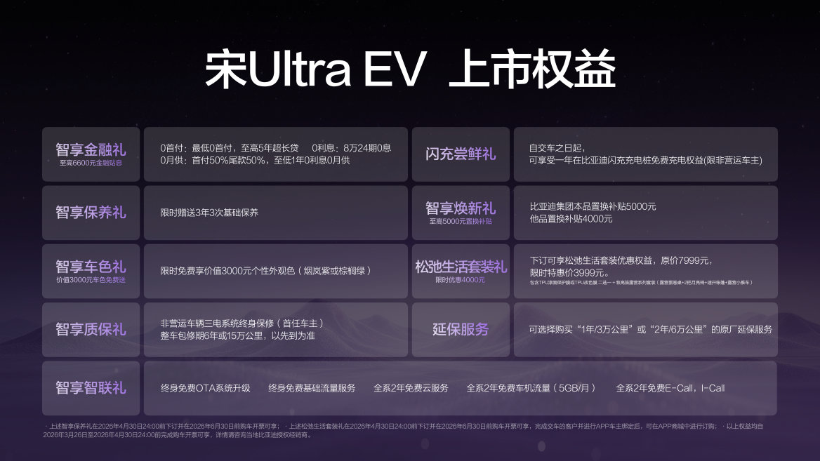 宋Ultra EV这台全球首款B级闪充SUV上市后,应该不会再有人说纯电跑不远、充电慢、电池贵,是“电动爹”了,15.19万起,全系标配第二代刀片电池和闪充技术,5分钟充好、9分钟充饱,零下30℃充电也仅慢3分钟,全球最快量产充电速度属于是,完全用颠覆技术打造越级体验。