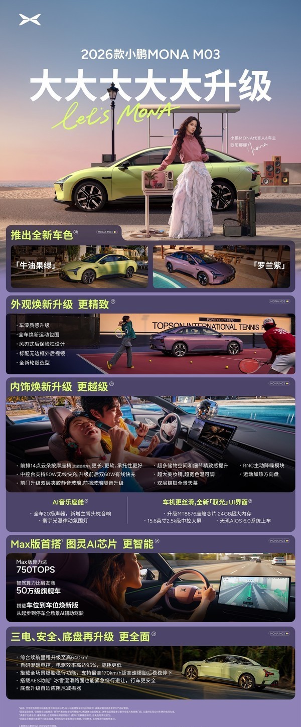 小鹏MONA M03 4月2号晚上7点半直接交车。不是预告,不是概念,车已经停在店里了,3月27号就能试驾。我上周在东莞门店摸了实车,座椅按摩是真能按到肩胛骨,玻璃一关,外面喇叭声立马闷了一半。 它用的图灵芯片,不是老款Mobileye或者地平线,小鹏自己训的模型跑在上面。官方说能做“车位到车位”,我没试全,但自动泊车进了三次,一次比一次快,第三次干脆没踩刹车。 640公里续航标的是综合工况,不是CLTC那种吹出来的数字。风阻系数0.194,后保险杠像把风往两边切,后视镜也没边框,跑高速确实更稳。 爆胎稳行测试做到170km/h,听着吓人,其实靠的是底盘线控+ESC+AI预判三块一起动,不是光靠刹车硬拉。
