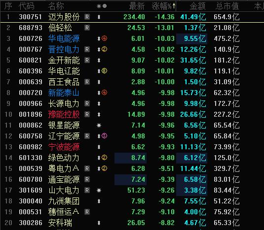 今天A股跌幅榜,跌停股清一色的电力股,电力三大龙头全部跌停,华电能源止步24连阳跌停,华电辽能9板被砸后跌停,豫能控股上周五尾盘突袭涨停今天跌停。 龙头不死主线不止,现在龙头全部跌停,资金出逃电力股,电力股跌停潮。 迈为股份大跌14CM,全A跌幅第一;华电能源跌停板,晋控电力跌停板,金开新能跌停板,长源电力跌停,新能泰山跌停,银星能源跌停,辽宁能源跌停,宁波能源跌停,等等。 电力股上周四,周五强分歧,今天没有弱转强,分歧转一致,反而是跌停潮,走出退潮走势,电力退潮,资金高低切,今天切了科技股,商业航天,福建,创新药等等方向。 按照市场每月一条主线,现在月底,3月最强主线大跌,那么4月新主线就在今天,明天的盘面,所以打起精神,这也是今天马犇火力全开,平铺三个方向,因为不知道那个方向是主线,所以低吸拿个先手,等确认,再集中火力猛攻。