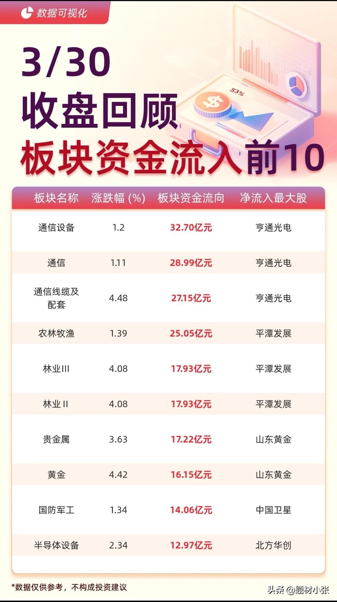 3月30日A股收盘复盘:资金冰火两重天,通信板块逆势走强 3月30日A股收盘,资金流向呈现明显分化。个股层面,平潭发展以17.89亿元主力净流入领跑,通信赛道成资金扎堆方向,亨通光电、永鼎股份等多只通信股跻身流入前20;而电力设备赛道遭遇资金大幅出逃,阳光电源、隆基绿能等龙头股净流出额均超10亿元。 板块层面,通信设备、通信、通信线缆及配套三大细分赛道包揽资金流入前三,合计净流入超88亿元,农林牧渔、黄金板块也获资金大幅加仓;反观电力设备板块单日净流出超125亿元,公用事业、电力板块紧随其后,光伏、火电等细分赛道同步承压。 整体来看,市场资金呈现明显的结构性行情,通信产业链成当日最强主线,而新能源赛道则遭遇资金集体抛售,后续需重点关注主线持续性与资金回流方向。 数据仅供参考,不构成投资建议!