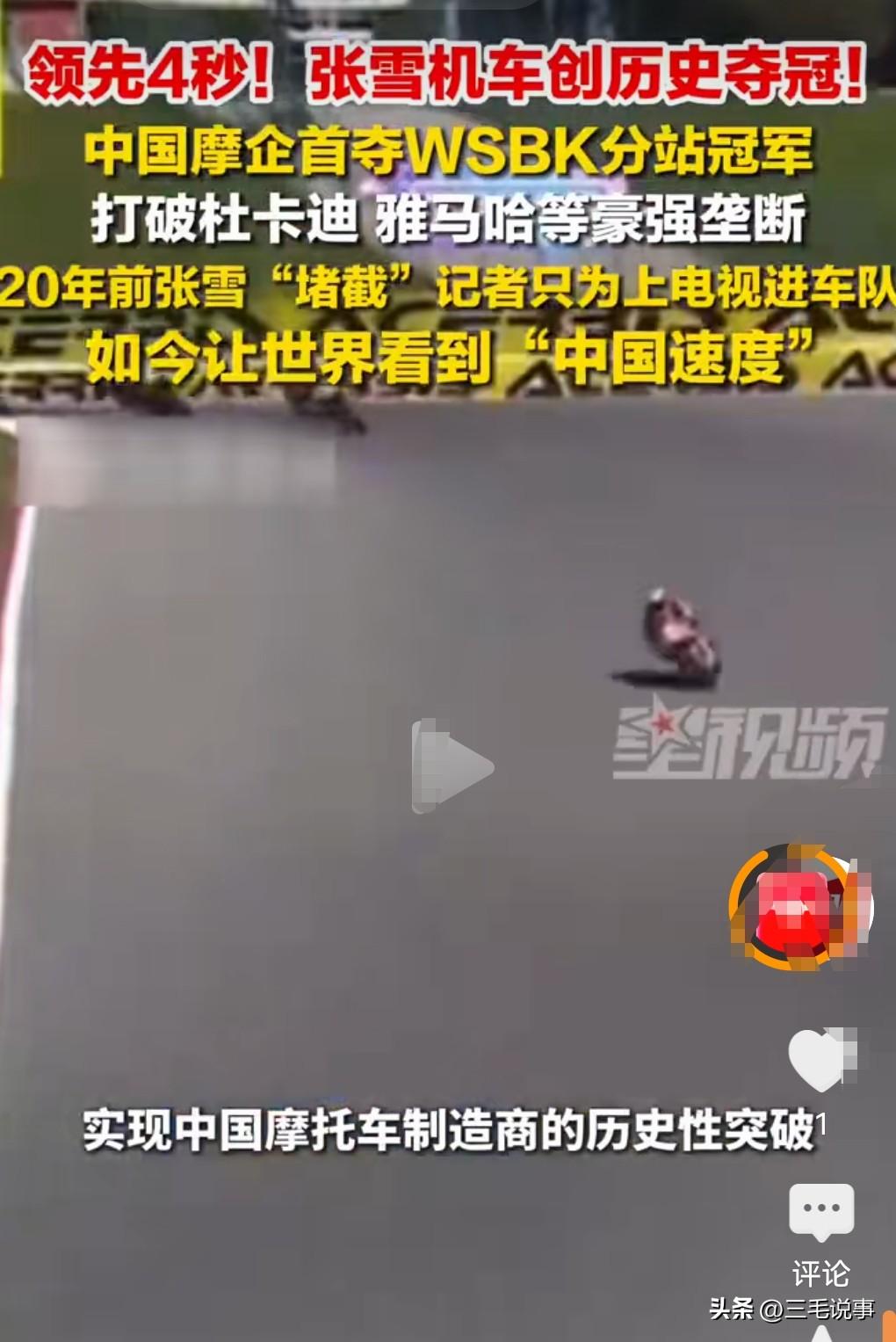怪不得这么令人激动人心了。原来领先其他机车四秒夺冠。 四秒那真的能开很远一段的距离了。 这真的是太给力了,张雪机车突然就火了,上热搜了。 之前被骂,没想到一下就让人竖起了大拇指。 打破杜卡迪、雅马哈等豪强垄断,这就值得让人肯定了,毕竟在这一领域,在机车间我们也崛起了。 这几年中国的发展真的是让世界瞩目,有太多创新创造记录的时刻。 中国必须站在世界之巅,才对得起中华文明上下五千年。