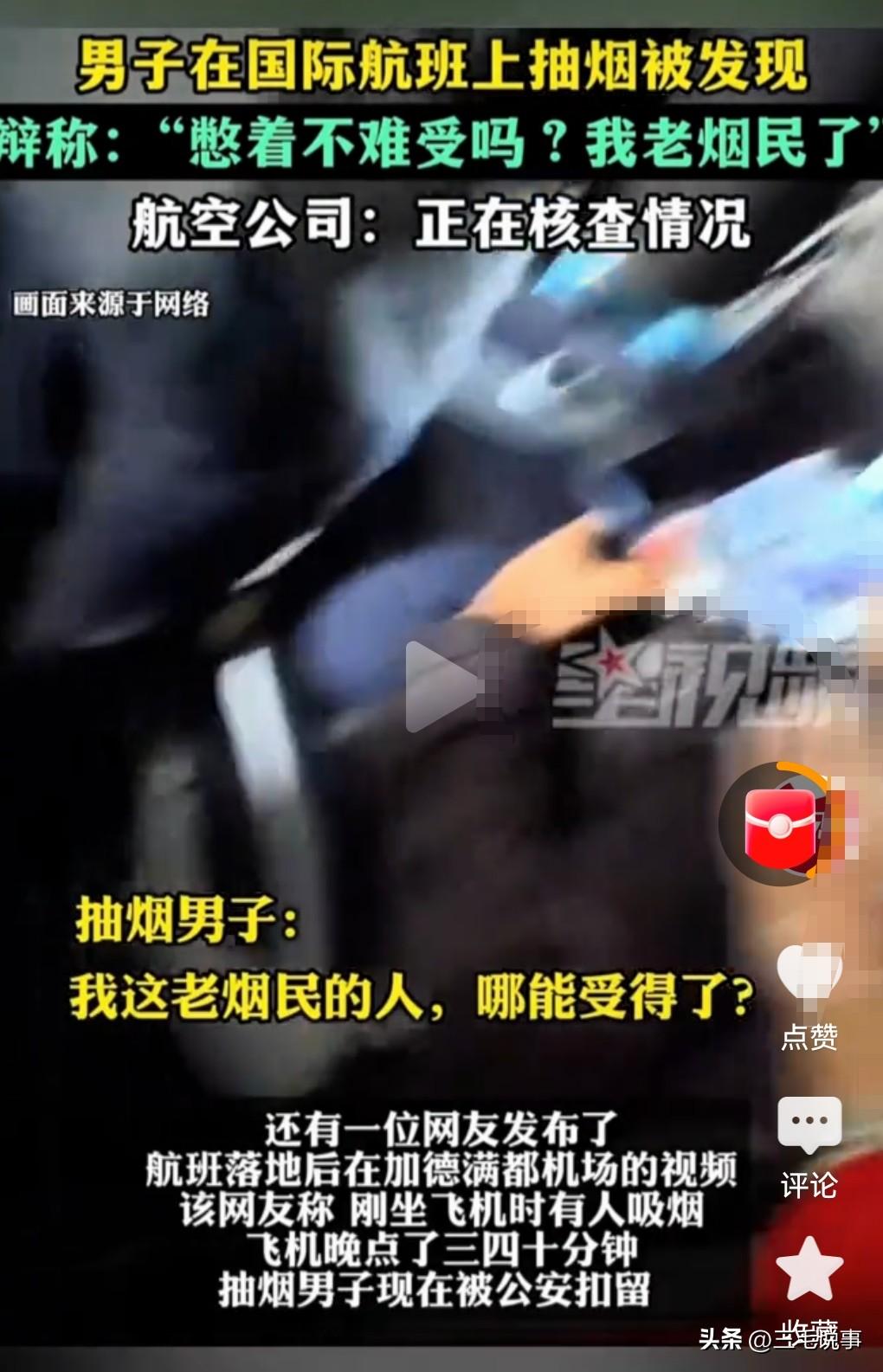 这真是太离谱了吧,竟然敢在飞机上抽烟,这真的是无法无天啦。 3月29日,一男子在国际航班上抽烟。 这也真是个奇葩,这是一点都不懂规矩啊。 他还振振有词的说道,我是老烟民了,憋着不难受吗? 当然下飞机后就被扣留了。 只要敲响了警钟,千万别干这种蠢事。 再说了,抽烟也不是什么好事,对自己也不好,飞机上抽烟那是让别人抽二手烟,是很没素质的行为,也涉及违法了。 还弄得烟雾警报器都报警了。