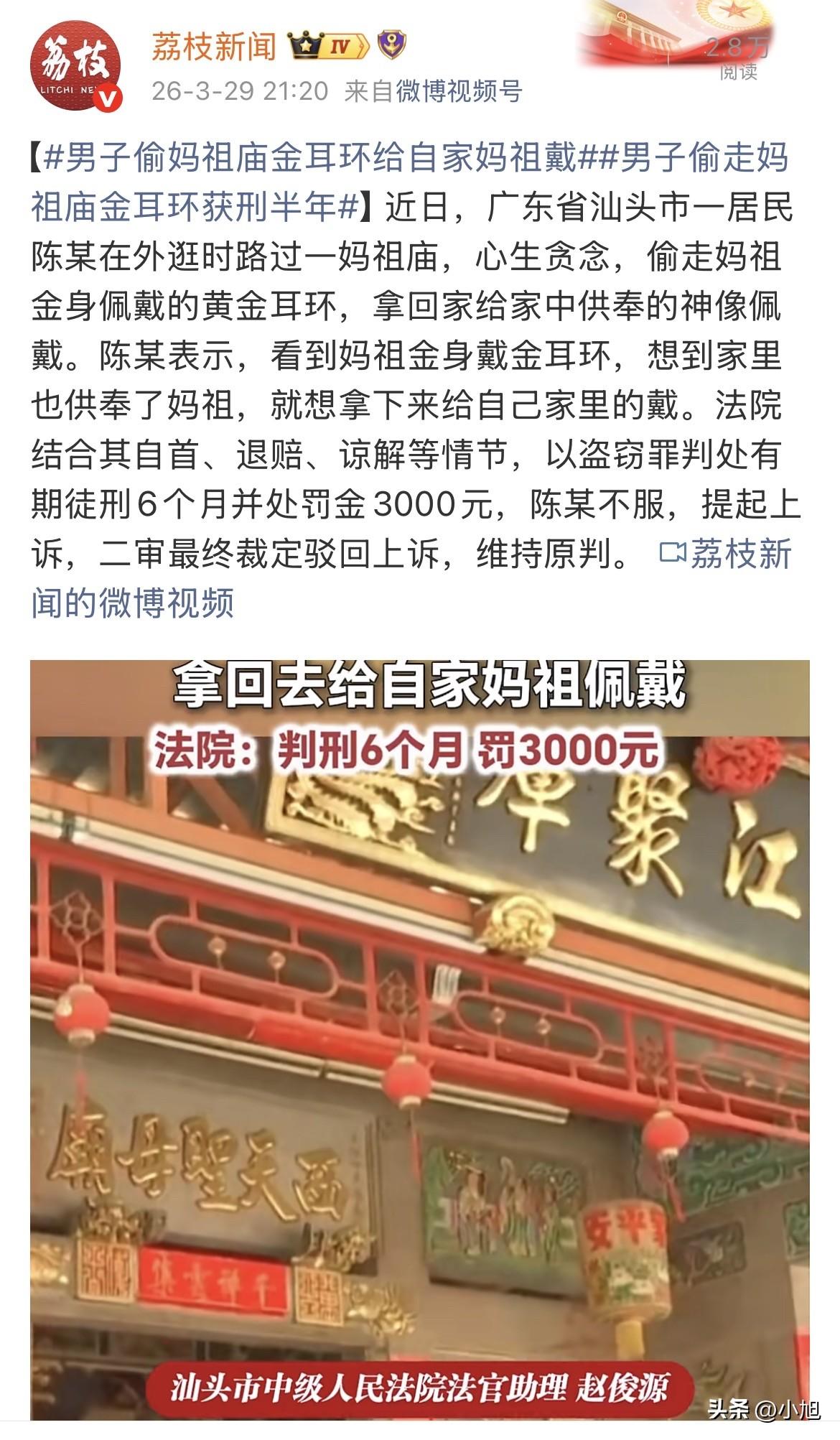陈某大概觉得,都是妈祖,庙里的和家里的没什么区别。拿庙里的给家里的戴,不叫偷,叫“请”。何况他自己家里也供妈祖,说明他确实是信这个的。