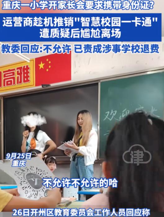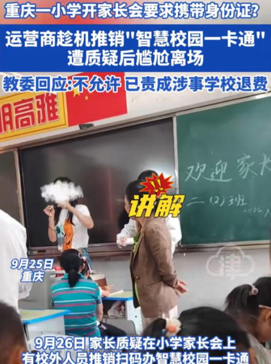 “必须严查。” 重庆,一小学开家长会,要求家长带身份证,家长进教室后,才发现还有不是老师的人在教室,甚至还要求他们开通价值 120 元一张的 “智慧校园一卡通”,没曾想这些人竟是运营商,家长直接怒了,大喊道谁规定反对一定要办? 2024年的一个上午,重庆某个小学里上演了一出让人哭笑不得的闹剧,好好的家长会硬生生被开成了“大型推销会”。 事情是这样的,开家长会的前几天,老师在群里千叮咛万嘱咐,要求家长们这天必须带上自己的身份证,而且还立了规矩:开会期间不许玩手机。家长们都是老实人,心里琢磨着估计是学校要统一登记孩子的信息,或者办什么入学的正规手续,谁都没往别处想,乖乖地揣着身份证就去了。 家长们按时坐进教室后,班主任在讲台上就简单敷衍了十来分钟,说了说孩子的学习和班级纪律,眼瞅着正事刚开了个头,班主任突然话锋一转,直接从门外请进来了两个陌生的女人,这俩人根本不是学校的老师,仔细一看,竟然是联通公司跑业务的工作人员! 这俩人一上台,立马变戏法似的掏出一大摞资料挨个发,还把几个收款二维码往黑板上一贴,就开始口若悬河地推销起一款叫“智慧校园一卡通”的东西。 据她们吹嘘,这卡一年交120块钱,好处多得很,什么孩子刷脸进校门啦,进出学校能给家长手机发提醒啦,还能用来接打电话。 这下家长们全懵圈了,大家为了孩子的学习特意请假跑来开会,怎么一转眼就成了推销大会?更让人来气的是,大家这才恍然大悟,原来学校提前几天非逼着大家带身份证,根本不是为了什么教育登记,纯粹是为了今天方便这帮人给家长办卡开户! 有个脾气直的家长当场就火了,站起来大声质问:“你们搞这个,是上面教育局下发了红头文件让办的吗?有本事把文件拿出来给我们大伙瞅瞅!” 那两个推销员一听要文件,立刻变得支支吾吾,半天也拿不出一张盖公章的纸,只能翻来覆去地拿那套话术搪塞:“咱们这是完全自愿办理的,不强求。” 可你看看这架势,哪有一丁点自愿的意思?班主任站在旁边一言不发,甚至还时不时帮着推销员打打圆场。 更离谱的是,有个家长尿急出去上厕所,顺道往旁边教室瞥了一眼,好家伙,连学校的领导都在隔壁班亲自赤膊上阵,帮着人家通讯公司卖力推销呢!等这乌烟瘴气的家长会好不容易熬到散场,这帮推销员干脆像门神一样堵在走廊里,看到没办卡的家长就生拉硬拽地接着忽悠,这摆明了就是“不办卡别想走”的软暴力嘛。 之前那个起头的男家长彻底压不住火了,一拍桌子吼道:“没红头文件你们凭什么跑到教室里来卖东西?这里是教书育人的学校,不是菜市场,更不是你们做买卖的商场!谁给你们的权力必须让我们办?” 其他家长一看有人带头,也纷纷跟着吐苦水:“我家孩子才读低年级,天天都是我们大人亲自接送,要你这个破提醒卡有个什么用?一张破塑料卡片成本撑死十几块,你们张嘴就要120块,这心也太黑了吧!”“学校跟你们通讯公司是不是私底下有什么见不得人的交易?” 家长们你一言我一语,教室里的气氛瞬间炸了锅。那两个推销员被怼得哑口无言,脸红脖子粗,最后实在待不下去了,只能灰溜溜地卷起铺盖走人。 可这事没完,家长们心里这口恶气实在咽不下去,当晚就在班级群里联合起来写了投诉信,还有人把当时吵架的视频直接发到了网上,这下好了,一石激起千层浪,全网的家长都跟着怒了。 教委反应还算迅速,立刻成立了调查组,教委当场拍板定调:学校私自把通讯运营商放进校园推销收费卡,属于严重违规,绝对不行!当天就勒令学校和联通公司把吃进去的钱一分不少地全吐出来。 第二天,处理结果就贴出来了:带头搞这事的校长被直接停职查办,家长交的钱全额退还,那家联通公司也被彻底拉黑,再也不准踏进校园半步。 这大快人心的处理结果一公布,网友们纷纷拍手叫好:“这种把家长当提款机的学校就该狠狠整顿!”“打着为你好的旗号搞强买强卖,吃相简直难看死了!”“绝不能让本来干干净净的学校变成某些人赚钱的工具。” 教育部早就下过死命令,严禁任何形式的商业广告和推销活动溜进学校,特别是义务教育阶段,乱收费更是高压线。 这所小学倒好,借着家长会的名义给家长下套,不仅伤了家长们对学校的信任,更是明目张胆地破坏了教育的规矩。 幸亏这届家长不好忽悠,敢于站出来硬刚,最后成功把钱要了回来,也把不良风气赶出了学校。 这也给所有学校敲响了重重的一记警钟:学校是教书的地方,不是做买卖的生意场,别总想着拿家长的软肋和孩子做筹码来圈钱。 对此你怎么看? 信源:津云
