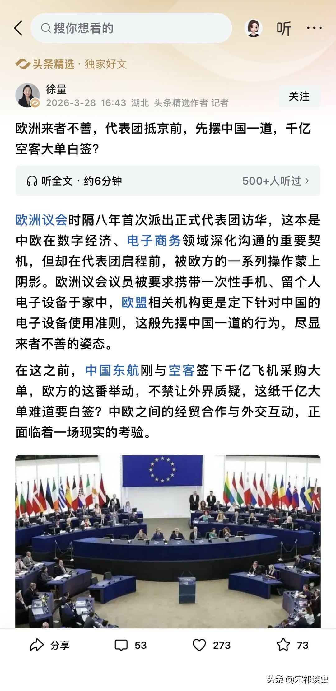 欧洲议会8年来第一次正式访华,人还没上飞机,就先给中国来了个“下马威”? 9个议员,每人一部一次性手机,个人电子设备统统不许带,回国后还要彻底格式化。这是什么操作?防贼呢? 嘴上说是为了“信息安全”,实际上还是在炒作老掉牙的“中国间谍威胁论”。说白了,就是不信任中国,还非要来谈。 就在这之前,中国东航刚跟空客签了1088亿的大单,一口气买了101架飞机。这钱还没捂热乎,转头就摆出一副“防着你”的架势。 边拿订单,边搞防备,既想赚钱,又想立牌坊,这算盘打得也太精了。 中欧是第二大贸易伙伴,光去年就有46亿个小包裹从中国发往欧洲,占欧盟进口小包的91%。 这么大的生意摆在这,搞这些政治表演有什么意义? 想合作,就拿出诚意。一边伸手要利益,一边处处设防,这种双标,中国不吃这套。
