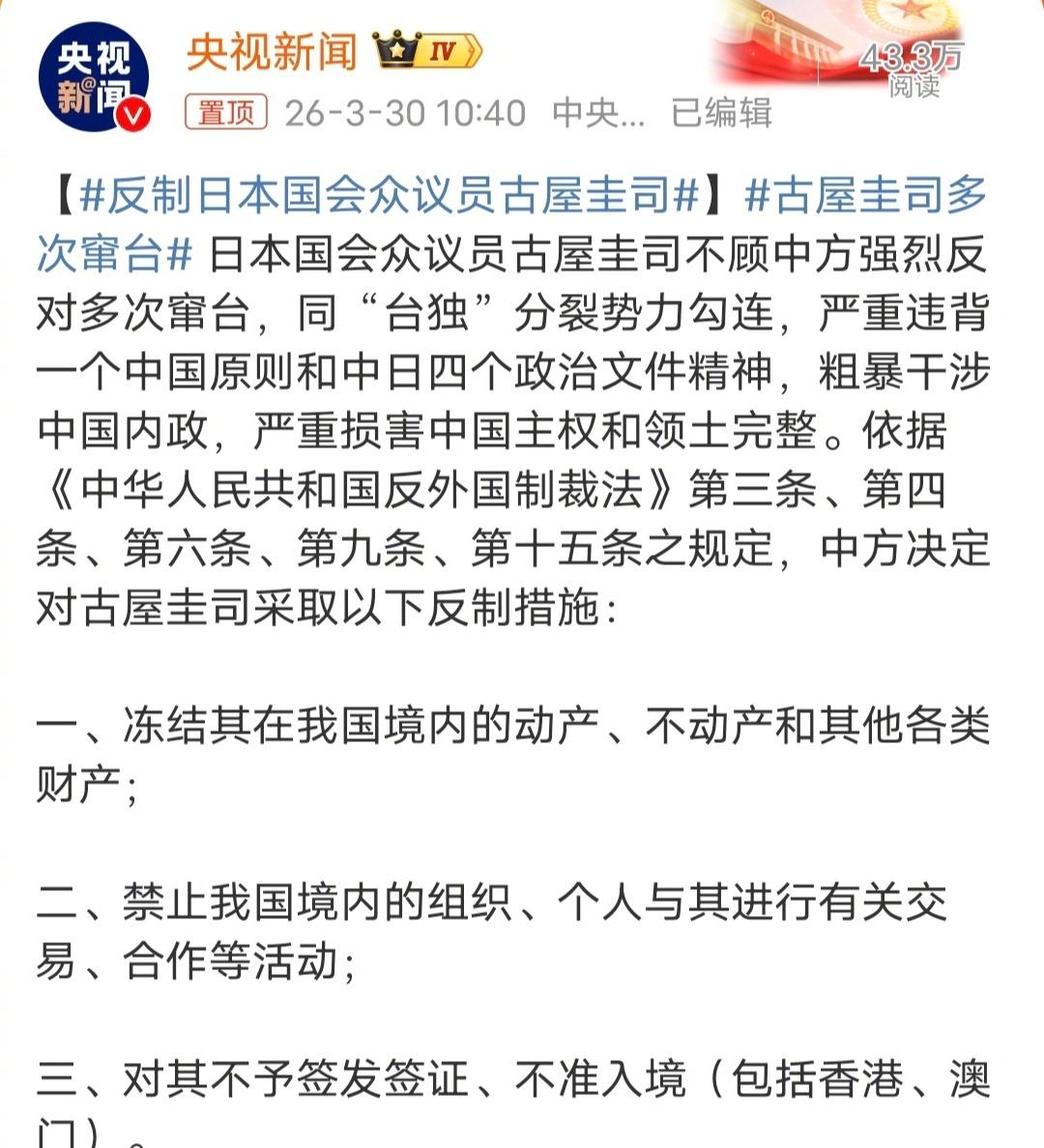 一、冻结其在我国境内的动产、不动产和其他各类财产; 二、禁止我国境内的组织、个人与其进行有关交易、合作等活动; 三、对其不予签发签证、不准入境(包括香港、澳门)。