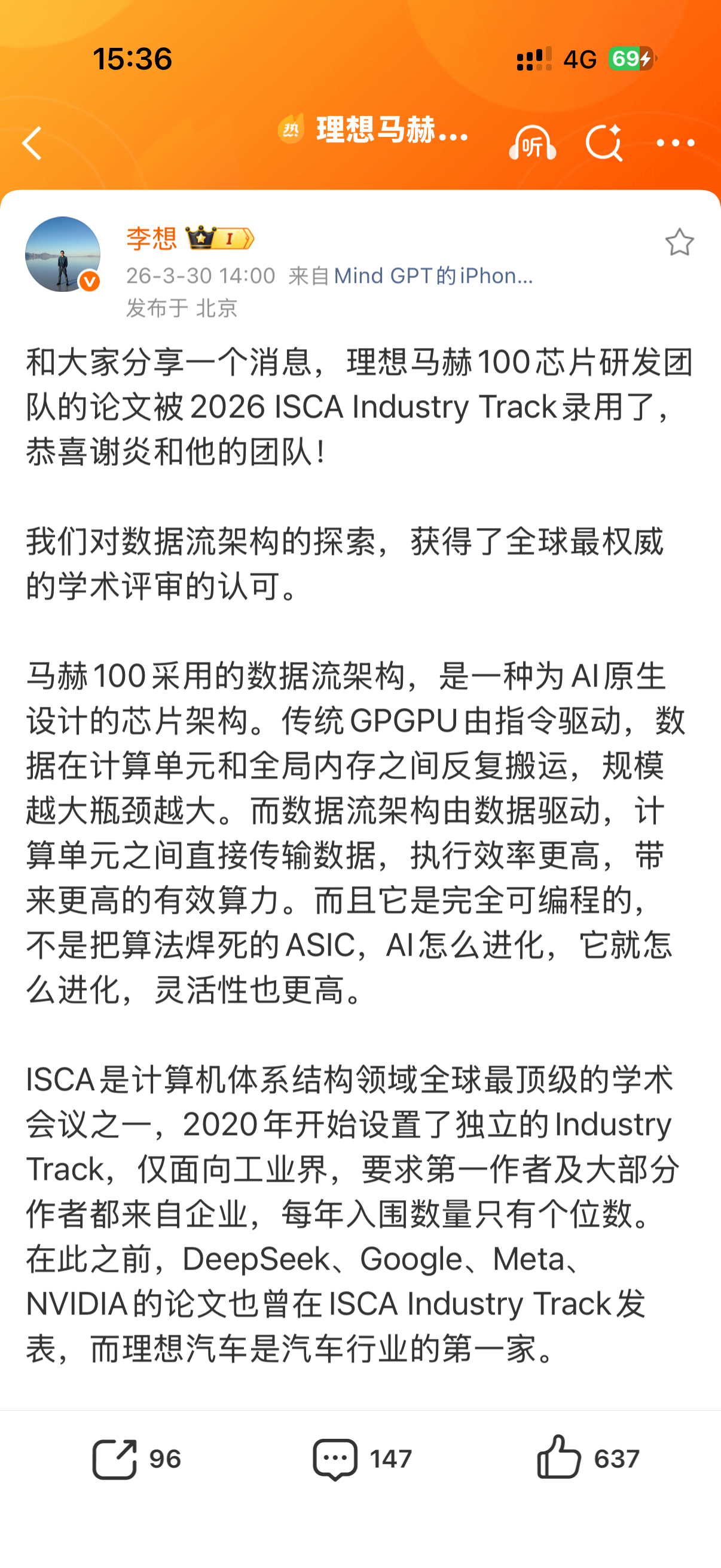 理想马赫100芯片理想马赫100芯片研发团队的论文被2026 ISCA Industry Track录用了,这是真材实料,牛逼啊。怪不得理想端到端做的很好,这研发能力不容小觑,互联网还是太小看理想了。