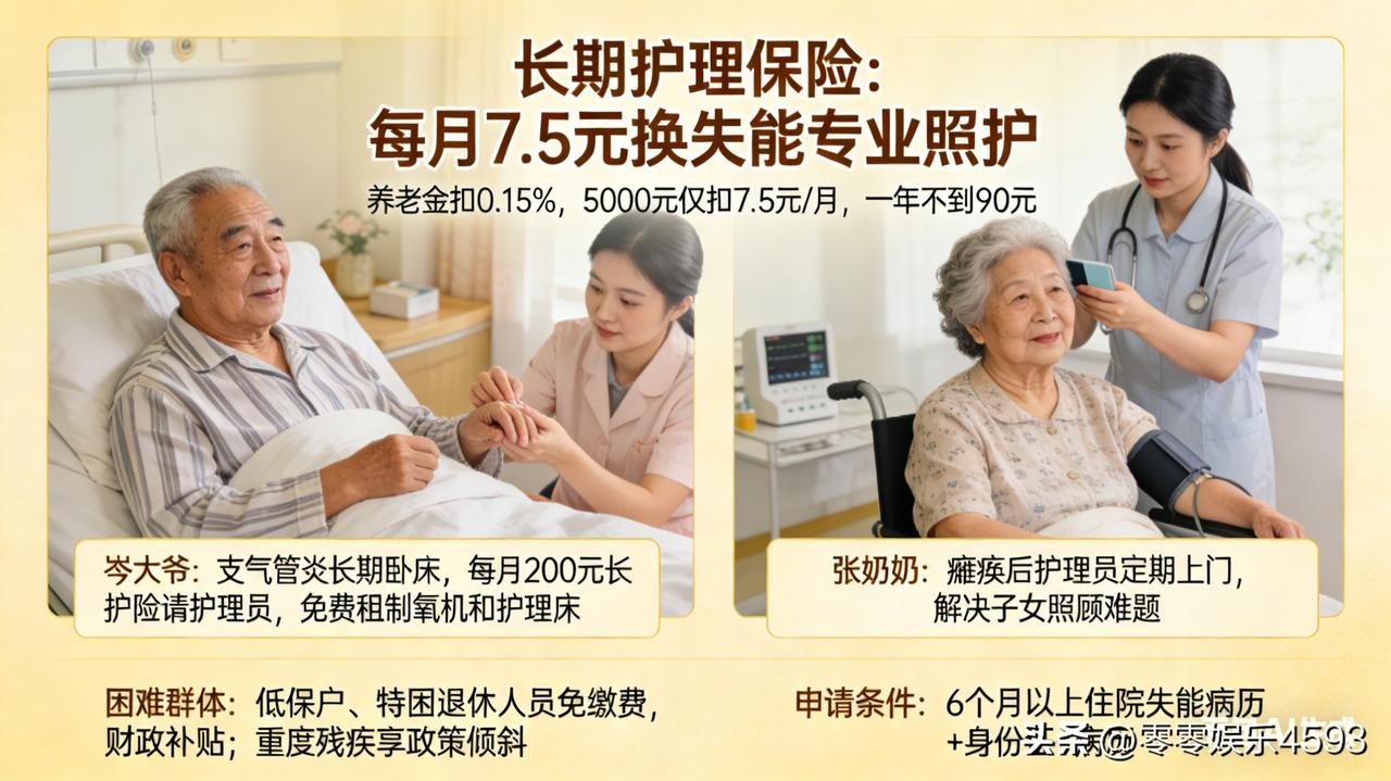 退休后最怕啥?不是生病看病难,而是失能瘫痪后没人照顾还花钱!现在国家推出的长期护理保险,每月从养老金里扣 0.15%,也就是 5000 元养老金仅扣 7.5 元 / 月,一年不到 90 元,却能换失能后专业照护和费用报销,对退休家庭来说太划算了!