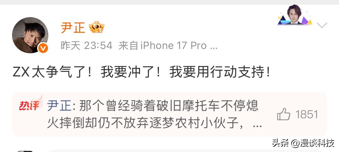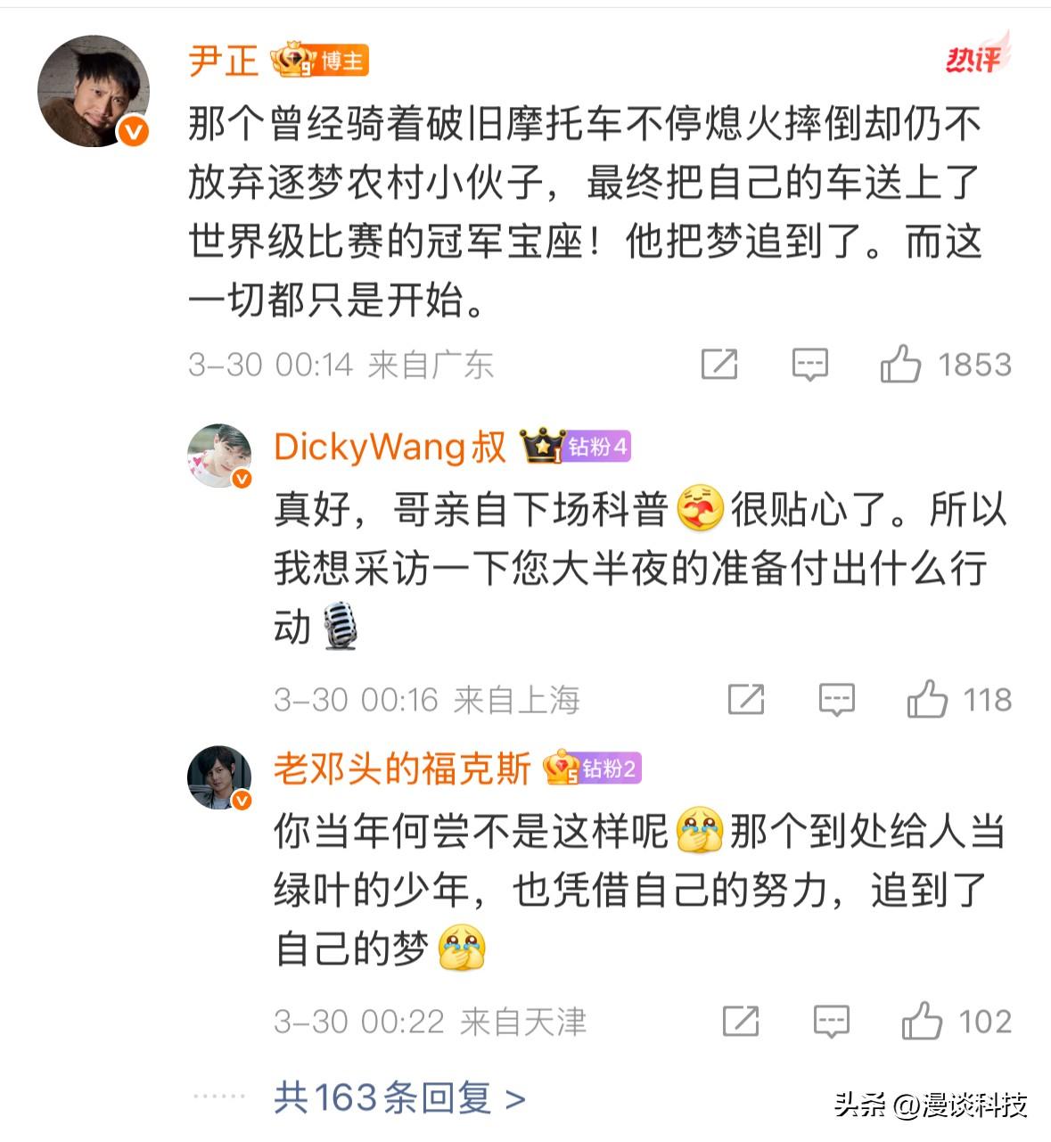 张雪回应尹正公开发文支持并购买820机车:按照正常剧本下来,我们应该邀请您做张雪机车的代言人,但是我又没钱,那我们就把这台张雪820送给你。您骑一段时间,就发个使用感受,觉得哪里不好就说,觉得哪里好也说,就相当于一个骑行分享。 张雪表示,尹正是演艺圈里面少数自己真正骑车而且真实参加过比赛的艺人。 今天刚看了张雪的经历,说的这个人真的很了不起,有梦想,有情怀,关键是有矢志不渝的努力,终于获得了巨大成功。正如尹正所言,“那个曾经骑着破旧摩托车不停熄火摔倒却仍不放弃逐梦农村小伙子,最终把自己的车送上了世界级比赛的冠军宝座!他把梦追到了。而这一切都只是开始。” 此前,张雪机车在2026年3月28日至29日的世界超级摩托车锦标赛(WSBK)葡萄牙站中,以自研赛车820RR-RS两度夺冠,打破欧美日品牌数十年垄断,成为中国摩托车工业里程碑事件,而其创始人张雪从湖南山村修车学徒到世界冠军缔造者的逆袭故事,更成为全民热议的励志焦点。