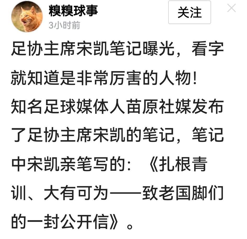 有网友透露某媒体人曝光中国足协主席宋凯的手迹,对其号召老国脚投身青训的做法大加溢美。但我更关心的是,这手迹从哪里来的? 球迷们经常吐槽,中国足坛诸如改制度定规则、选队员选主帅,很多大事都保不住密。如今更牛了,还能搞到足协当家人的工作笔记搞偷拍,并公开上网显摆自己,真够豪横牛逼。 如果这事是里应外合,真希望足协能内部清查排除异己;如果是外部窃密,则理应报警,严惩这种违法行为。