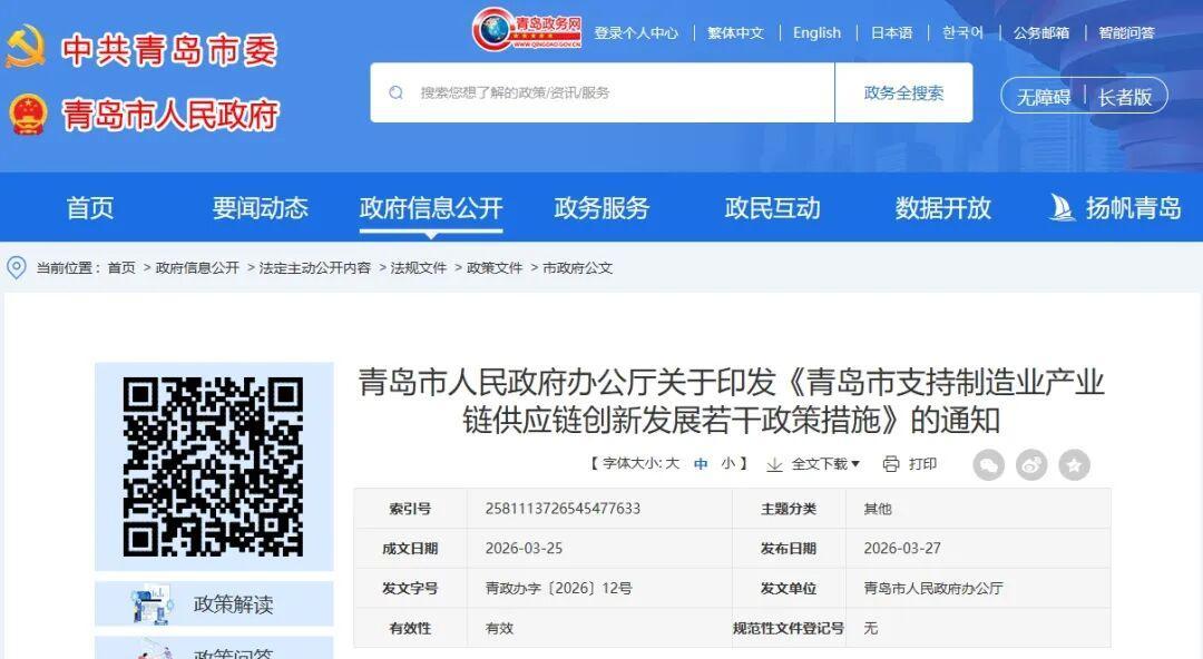 青岛豪掷百亿“链”动未来!芯片、AI、新能源企业速来,这里给钱、给地、给政策,就等你大干一场! 当许多城市还在为招商引资绞尽脑汁时,青岛已经甩出了一套“王炸”组合拳。这不仅仅是一份文件,更像是一封写给全国乃至全球制造业精英的“英雄帖”。它洞悉了每一个企业家内心最深处的渴望:不是单打独斗,而是在一个充满活力的生态里,被需要、被支持、被托举。 政策的本质,是读懂人心的需求。企业怕什么?怕创新孤独无援,怕配套远在天边,怕融资难如登天。青岛这次,直击痛点。它用真金白银告诉你,创新不再是你一个人的冒险。牵头攻关关键技术?支持!开放实验室给小伙伴用?鼓励!这背后,是把冰冷的产业链,变成有温度的创新共同体。 再看配套,它精准拿捏了中小企业的“晋升焦虑”。你是否苦于技术虽好,却难入链主“法眼”?青岛为你搭建阶梯。从“配套专家”培育库到“倍增计划”,再到单项冠军的重奖,每一步都有清晰的路标和丰厚的奖赏。这意味着一家默默无闻的配套厂,完全有机会成长为行业不可或缺的“小巨人”。 最狠的一招,在于“补链强链”的野心。它不再满足于简单的企业聚集,而是要主动塑造产业链的形态。“链长+链主”亲自下场招商,目标直指智算芯片、具身智能等最炙手可热的赛道。这相当于政府为你铺好红毯,帮你寻找最需要的合作伙伴,甚至为你并购重组买单。格局瞬间打开! 要素保障,更是体现了“保姆式”的诚意。钱的问题?有基金引导,有贷款贴息。人的问题?领军团队最高500万津贴,手笔惊人。地的问题?“拿地即开工”绝非空话。这一切都在传递一个信号:你只管专心搞技术、拓市场,剩下的麻烦,我来解决。 最终,青岛要构建的,是一个“你中有我,我中有你”的繁荣生态。链主开放场景,中小企业崭露头角;政府优先采购创新产品,给市场最坚定的信心。在这里,成功不是你死我活的零和游戏,而是整个产业链的共同胜利。这或许才是面向未来的、最高级的城市竞争力。 这份政策,是一面镜子,照见了青岛迈向“新质生产力”高地的决心与路径。它更是一把火,试图点燃大中小企业协同创新的无限激情。当一座城市愿意如此系统地、不惜成本地滋养它的产业土壤时,收获一片森林,或许只是时间问题。 (來源:青島日報《青島市人民政府办公廳印發最新通知》洵哥撰写) 青岛制造新政 产业链升级