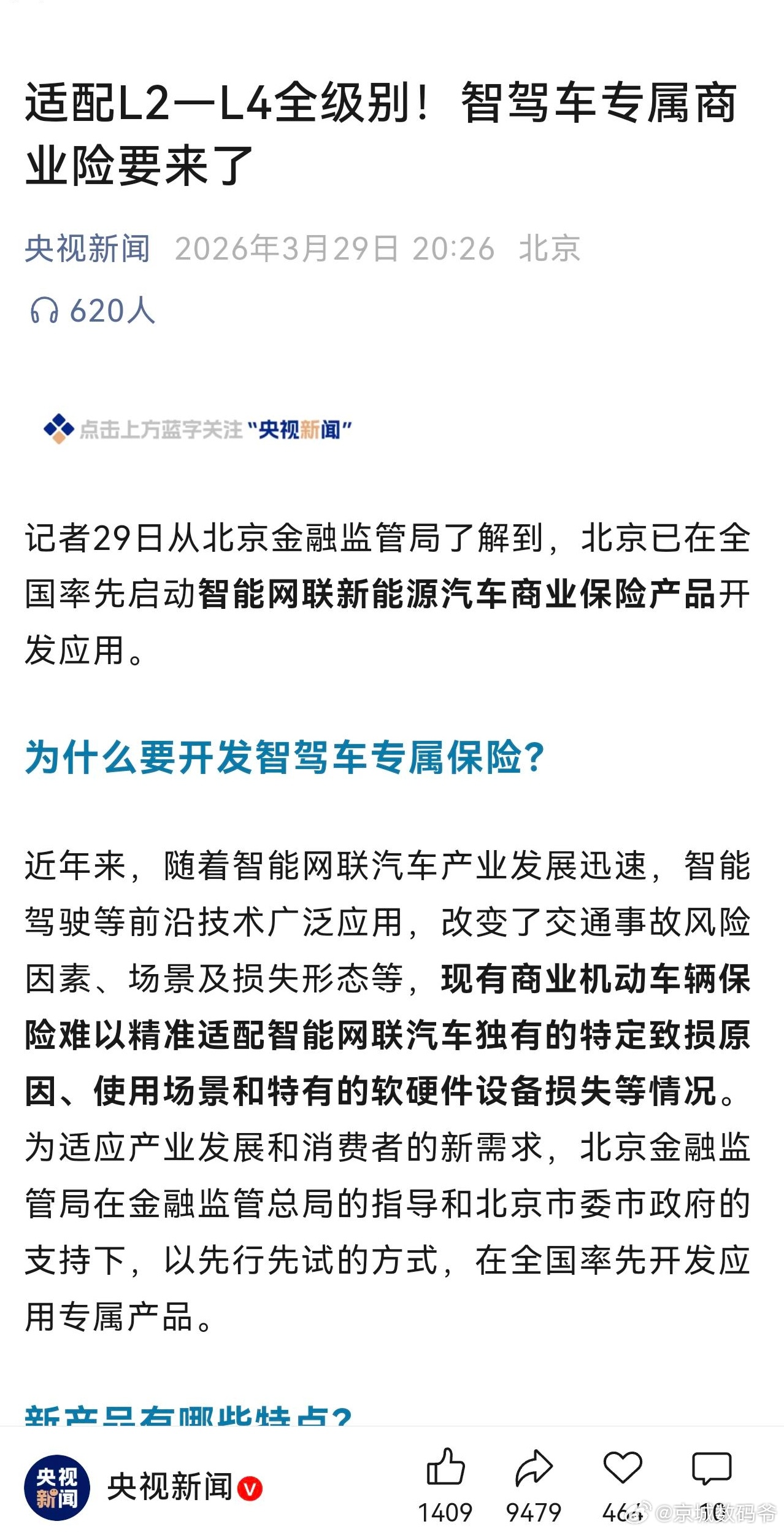 央视新闻:适配L2—L4全级别!智驾车专属商业险要来了!
