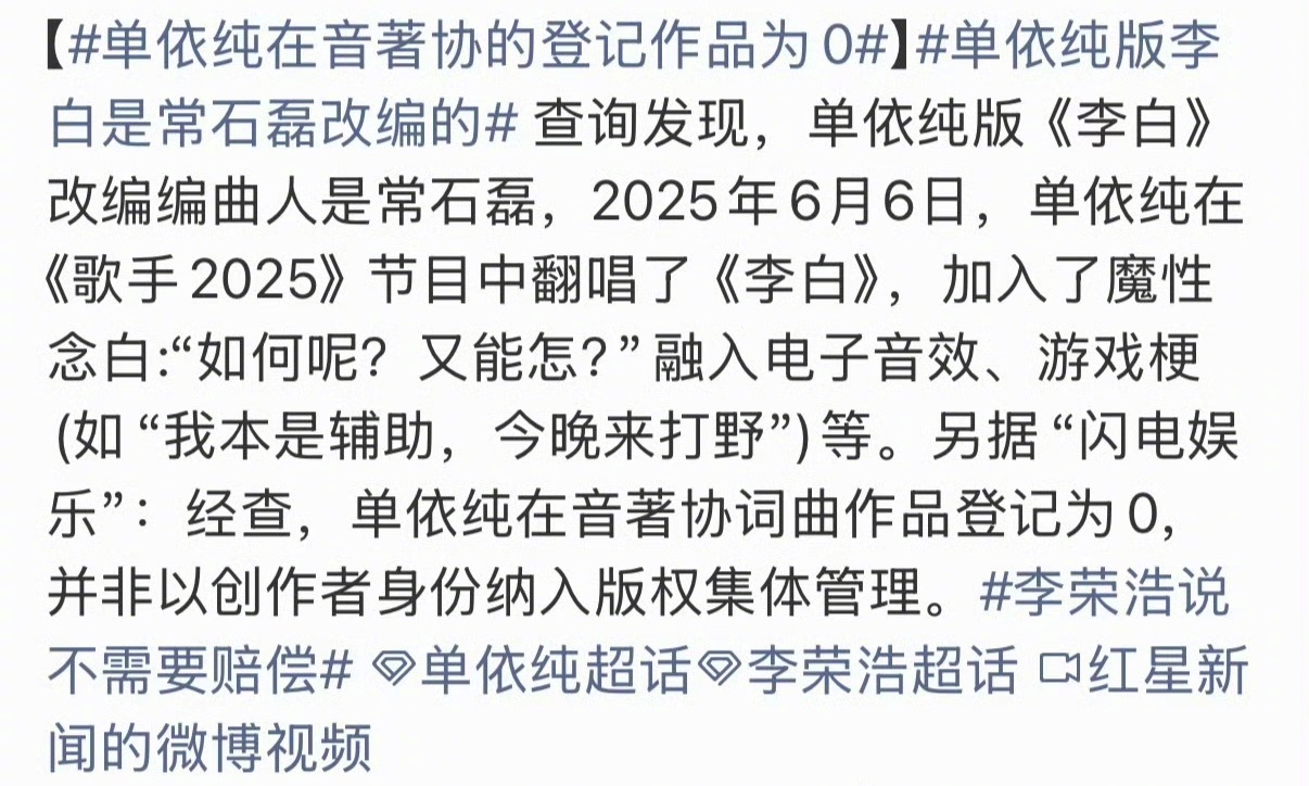 单依纯在音著协的登记作品为0唱得好和写得好是两码事吧。有人擅长用声音讲故事,有人