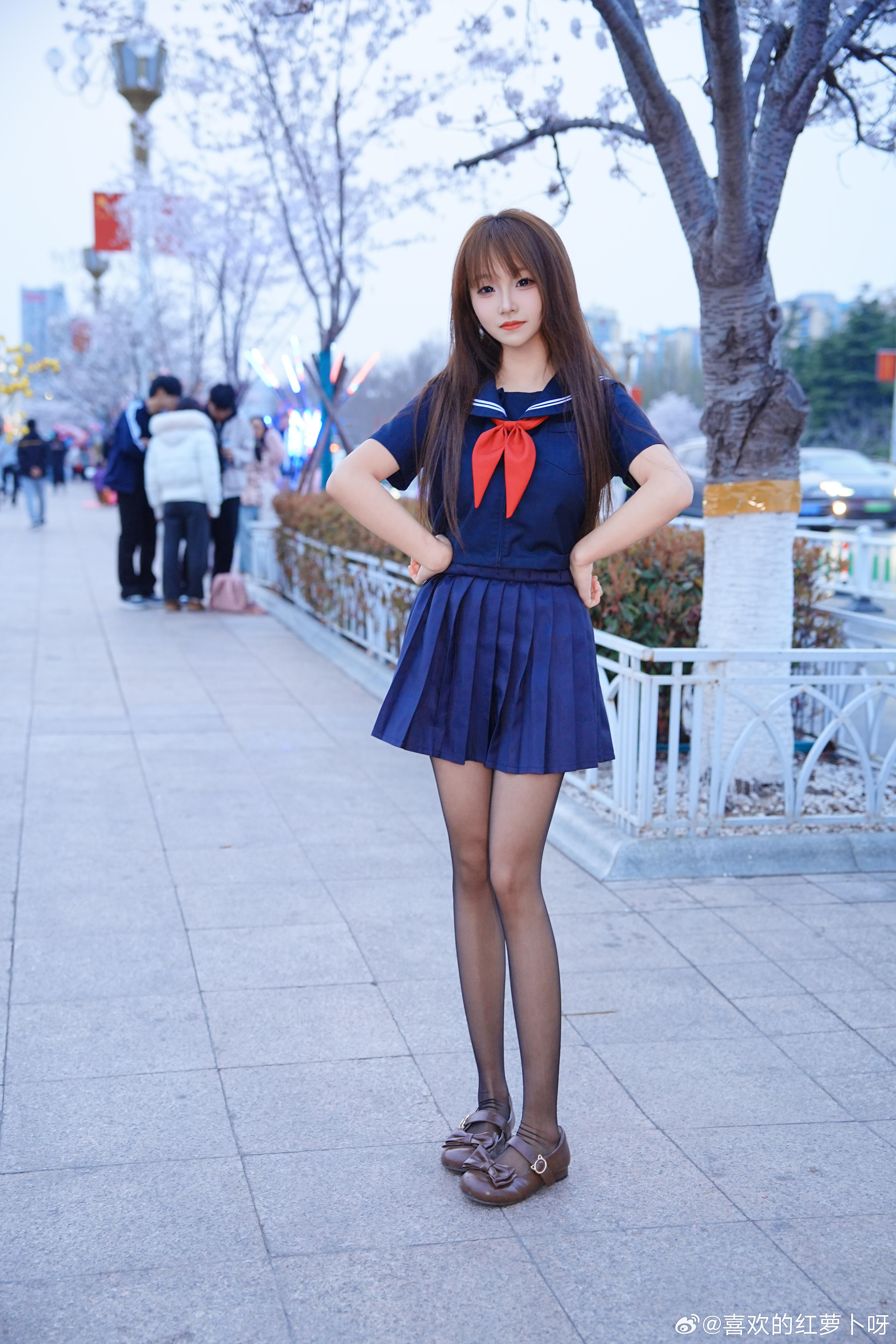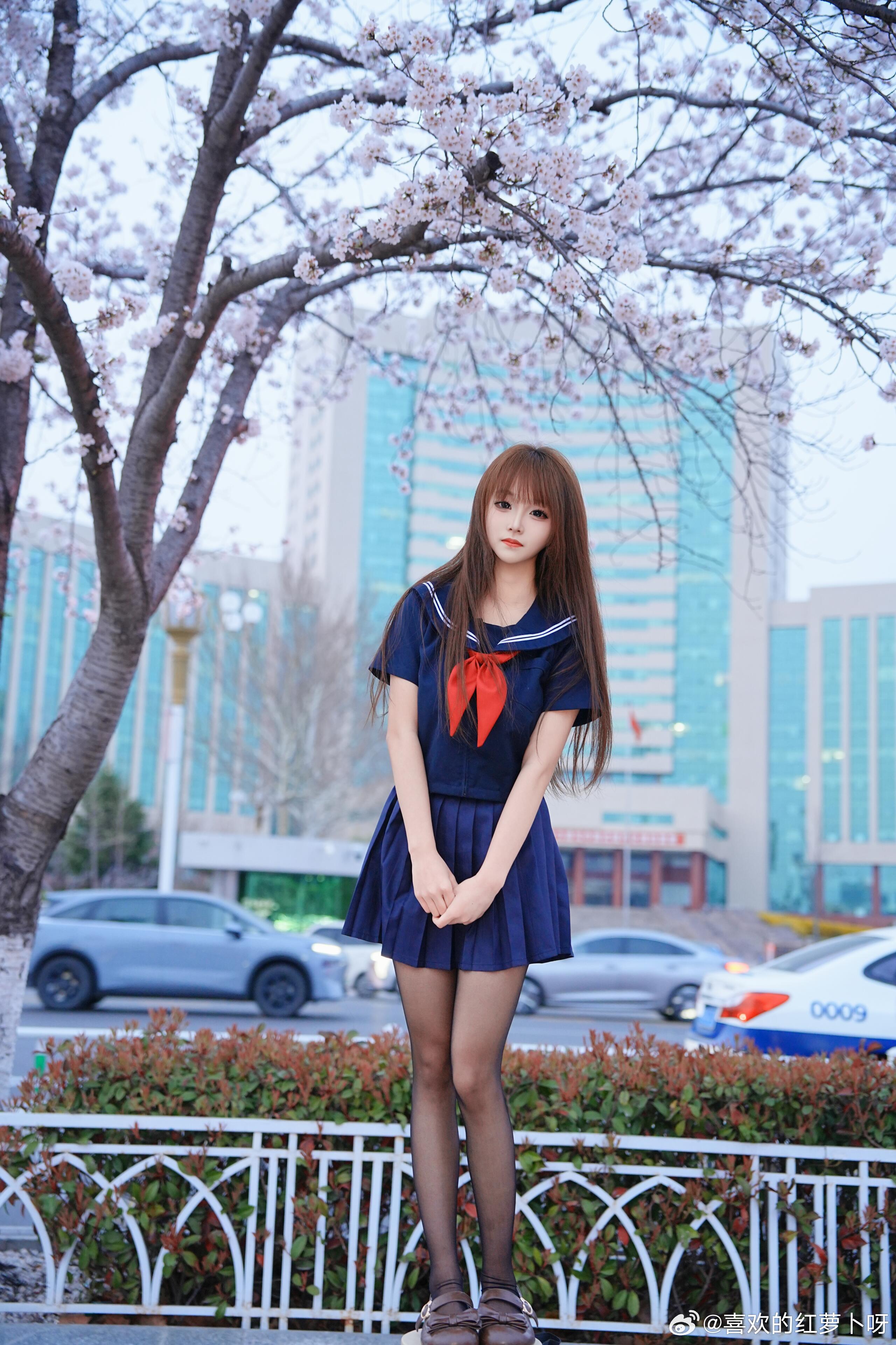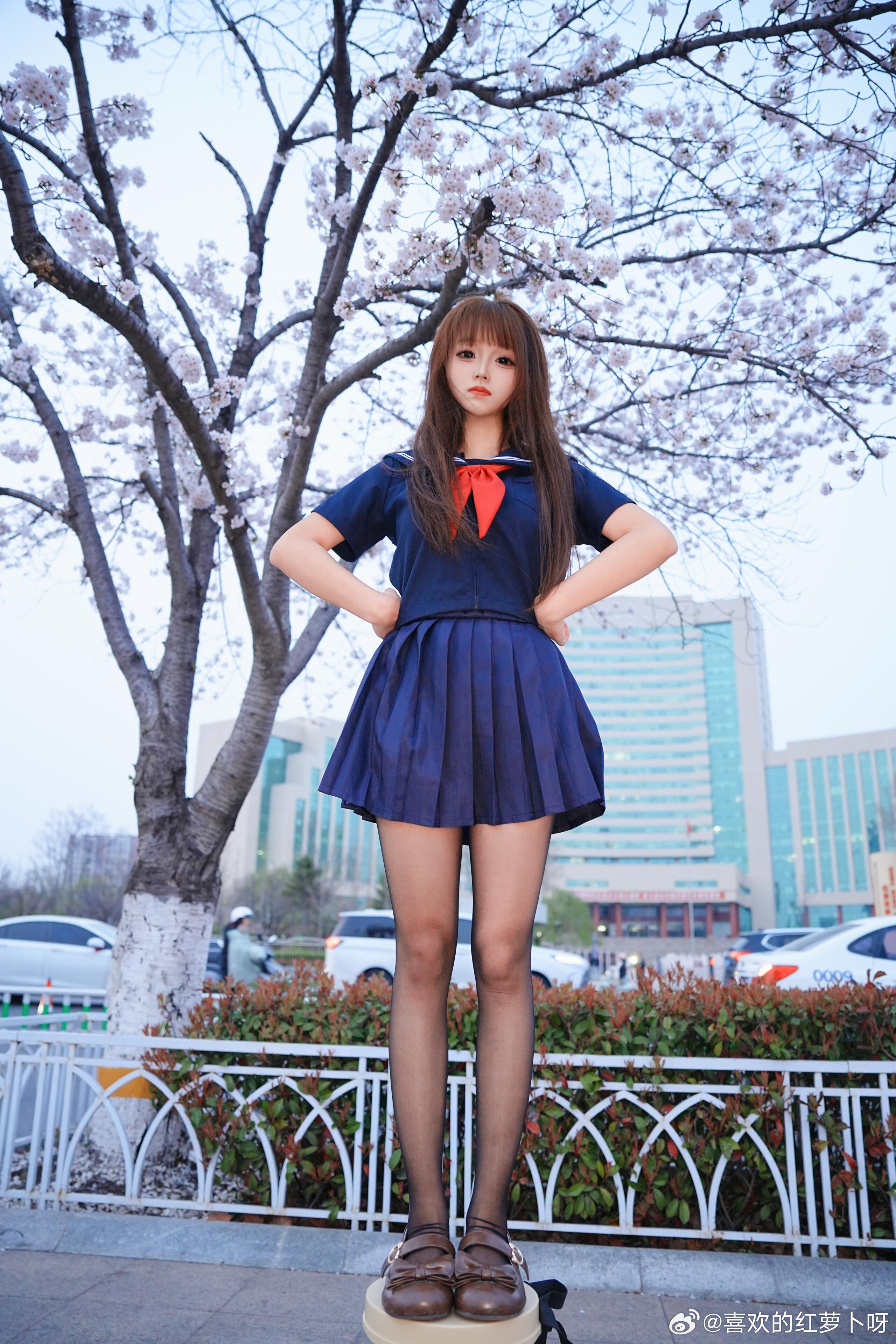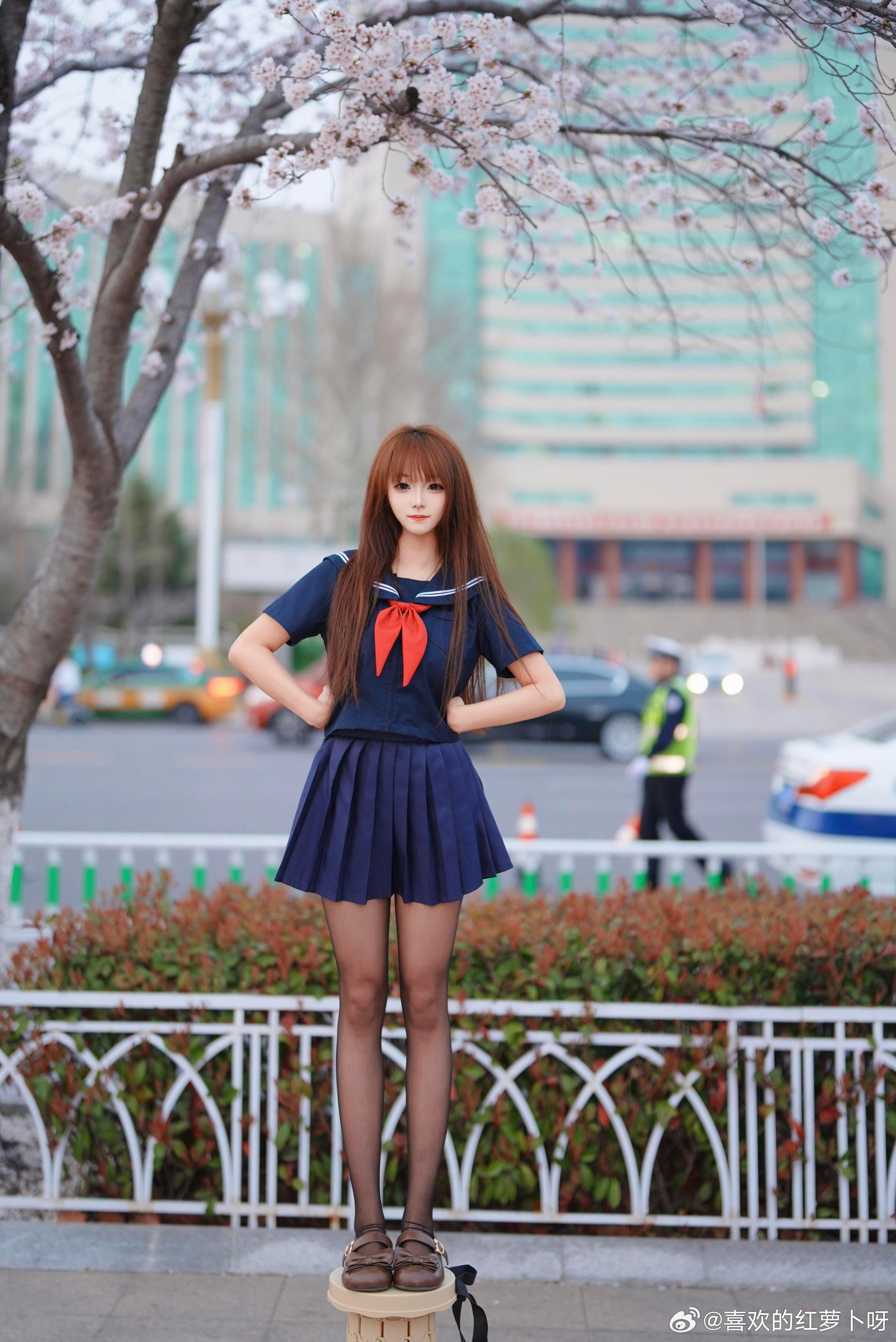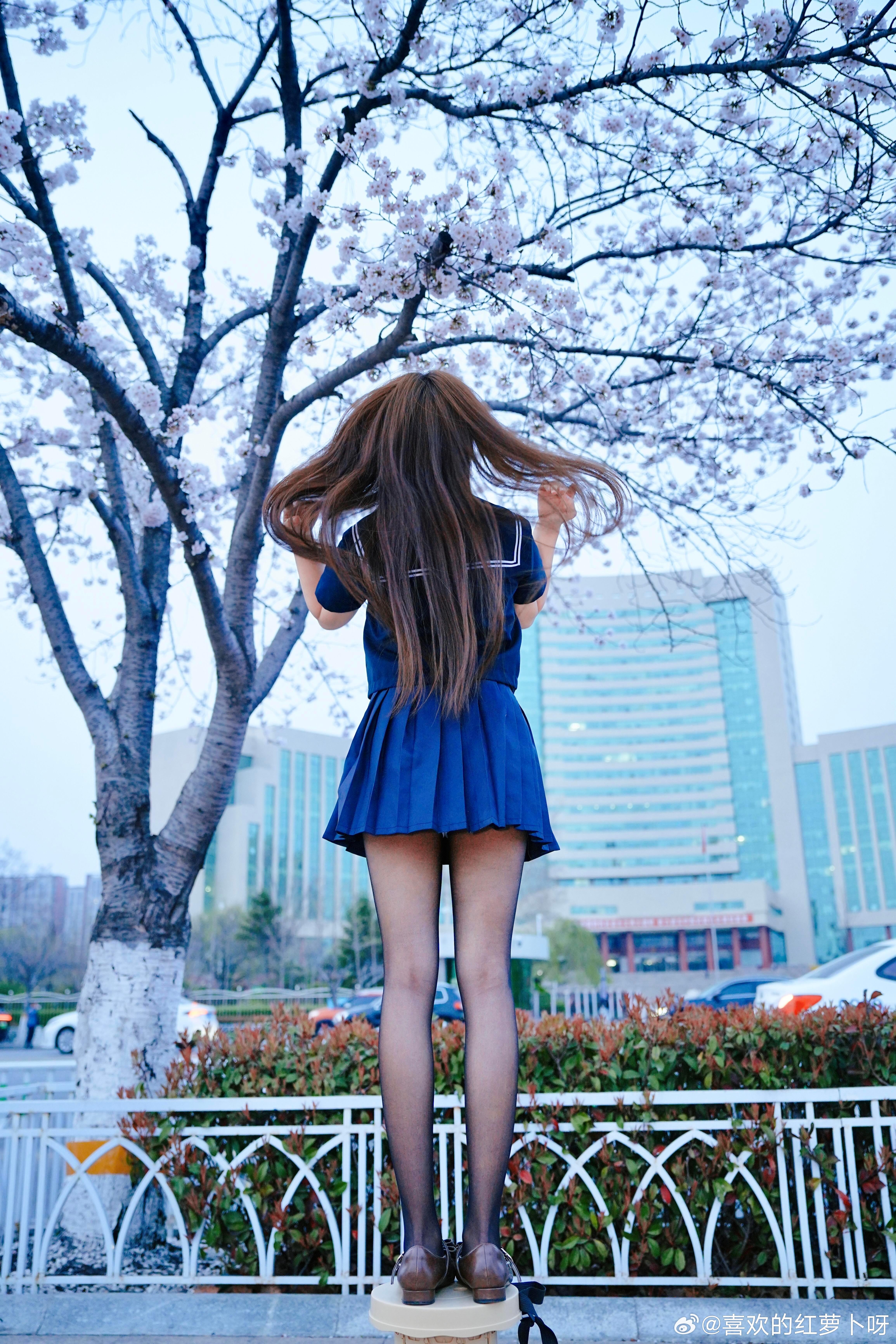 为了拍个樱花树下的jk少女,直接踩上梯子!