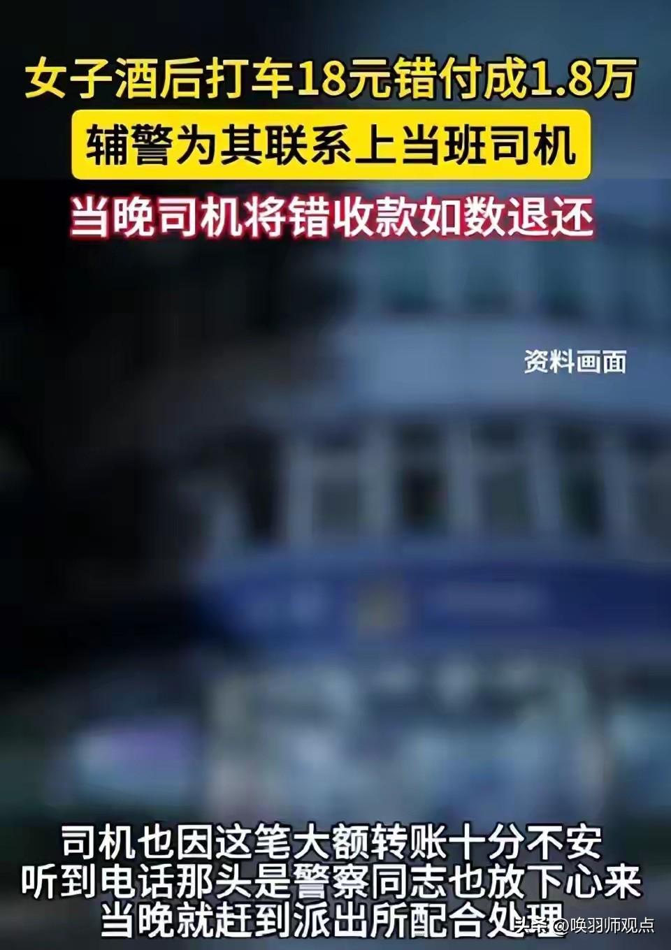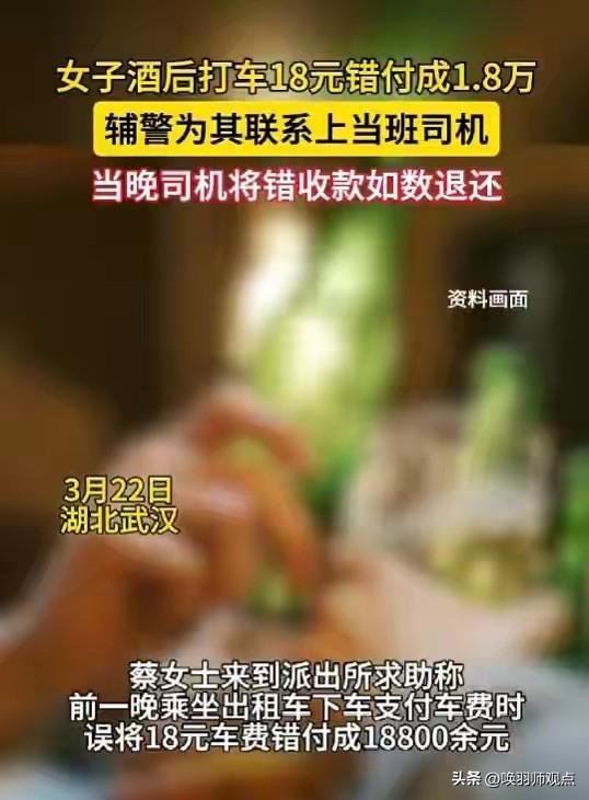 还是有钱!女子酒后打车,18元车费付成18800!报警能要回来吗?2026年3月22日,武汉蔡女士酒后打车,误将18元车费付成18800余元。次日发现后报警,辅警宋纳新根据乘车时间、支付凭证和上下车点位,一个多小时内排查锁定出租车司机。司机其实早已向公司报备,正愁找不到失主。当晚,司机赶到派出所,在辅警见证下如数退还。 深度解析: 事件圆满解决靠三股力量——辅警的“较真”、司机的“诚信”、公司制度的“兜底”。专家指出,这种“三方合力”是社会信任体系最坚实的基石。 反思与调整: 数字支付时代,大额支付应设指纹/人脸验证,酒后避免操作手机支付,发现转错账第一时间保存凭证、联系平台、报警求助。 历史关联: 从“路不拾遗”到“天价车费退还”,诚信美德在普通人身上延续。“君子爱财,取之有道。” 核心建议: 付钱前多看一眼,酒后少点一下。你的每一次小心,都是对自己钱包最大的负责。 互动话题: 你有过“手滑”多付钱的经历吗?后来追回来了吗?欢迎在评论区分享你的故事!错付车费事件 打车被讹 打车喝酒 打车白嫖 九街出租车撞人 九街出租车事件 错付车费自杀 无牌车费闯红灯 误付车费 千元车费 酒后免单 离谱车费 网约车白嫖事件 两女子白嫖车费 打车价
