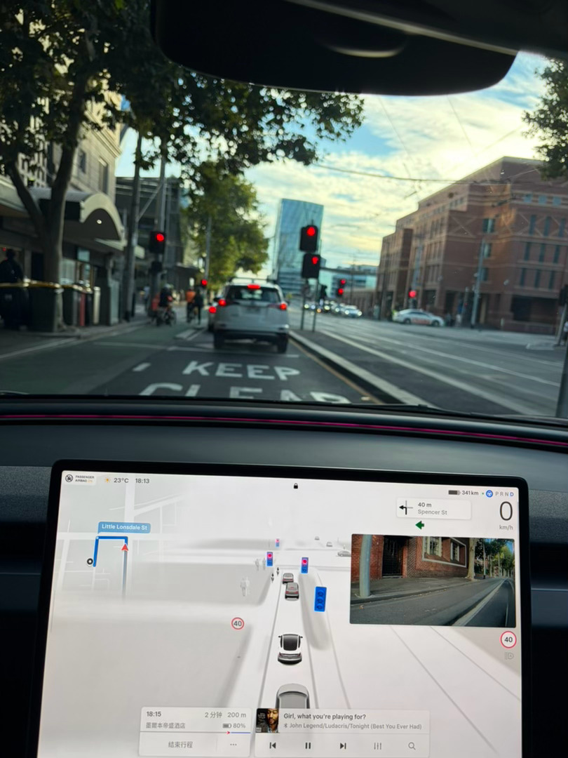 控车细腻稳如老狗、安心感拉满、选道能力强,对墨尔本City复杂交规的理解已经超越了99%第一次来墨尔本开车的人,对墨尔本特色的Hook Turn、大小环岛通行、和电车共轨这些场景都解的很好,反正开的比我好。礼让行人这块,预判行人轨迹的能力绝了,拍了好几个场景,不得不服