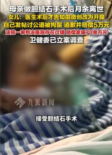福建厦门,女子的母亲做胆结石手术,本来是微创的,结果手术中,腹腔粘连严重,直接由微创改为开腹,7小时术后,医生才告知家属,她母亲术后一个多月就离世了,女子怀疑医院有过错,她就发帖讨公道,结果被拘留,还要道歉,并且赔偿5万元才能和解,女子无奈之下起诉医院,法院这样判了。 刘女士看着母亲被胆结石折磨得翻来覆去,痛得她嗷嗷叫,她就把母亲带到医院。 医生一检查,就跟刘女士说,要做微创手术,才可以解决胆结石的问题。 刘女士看着母亲一把年纪,就想着保守治疗,止疼就行了,毕竟有很多人有胆结石,很多人,一辈子都不做手术,都好好的,她也不想让母亲受罪,她选择保守治疗,对母亲更好。 但是接诊的主治医生李医生告诉她,她母亲的这种情况要做微创手术,这是比较好的治疗方案。 李医生态度坚决,刘女士动摇了,她也想母亲没有痛苦,她也听说了,胆结石可以做微创手术,对身体没有多大的伤害。 她再三思量,又和母亲商量了一下,她同意了给母亲做微创手术。 手术中,原本说好的微创手术,用不了多长时间,可刘女士在外面足足等了7个小时。 这7个小时,她内心很不安,她焦急地走来走去,时间仿佛停止了一般。 她也不知道内心被煎熬了多久,她终于等到医生出来了。 她看了一下时间,这个微创手术花了7个小时,手术为何要做这么长时间,刘女士满心疑惑。 就在这时,医生告诉了她一个天大的消息,说他的母亲在手术中,腹腔粘连严重,由微创改为了开腹。 听到这个消息,刘女士很心疼母亲,她喉咙一紧,眼眶就蓄满了泪水,她看着躺在病床上的母亲,她真的非常心痛。 她对医生的做法很不满意,医生在手术过程中,把微创改为了开腹,却没有通知她,也没有通知其他家属,擅自做了这个决定,刘女士万分不解。 好在母亲的手术已经完成了,她只希望母亲往后能够快点好起来,才不至于白受了这些罪。 让她痛苦的是,母亲做完手术后的一个多月,她离世了。 仅仅只是一个胆结石微创手术而已,不至于让她的母亲失去生命。 母亲如此突然离世,刘女士当然认为这是医生的过错造成的,她要为母亲讨个公道。 但是医生怎么可能轻易承认,她的母亲的离世,和他们的手术有关系。 医生不承认,刘女士也无法替母亲讨回公道,她很气愤,就以李医生的名义发帖,说遇到了奇葩的家属,求求同行们帮助她。 因为这个举动,别人告她诽谤,不但要她道歉,还要赔偿5万元。 她都没有替母亲讨回公道,自己又搭进去了5万元,她更加气愤了,这才起诉了医院。 刘女士认为,医生术后才告知她,由微创改为开腹,医生侵犯了他们家属的知情权,医生就是有过错的。 如果医生在手术的过程中有医疗过错,那么他们应当承担相应的赔偿责任。 《民法典》第1218条规定,医疗机构或医务人员在诊疗活动中因过错导致患者损害的,医疗机构应承担赔偿责任。 法院在一审的审理过程中,发现医院存在医疗过错,李医生也调离了原岗位。 法院判决医院需要赔偿70多万给家属。 那么你对此有何看法呢?