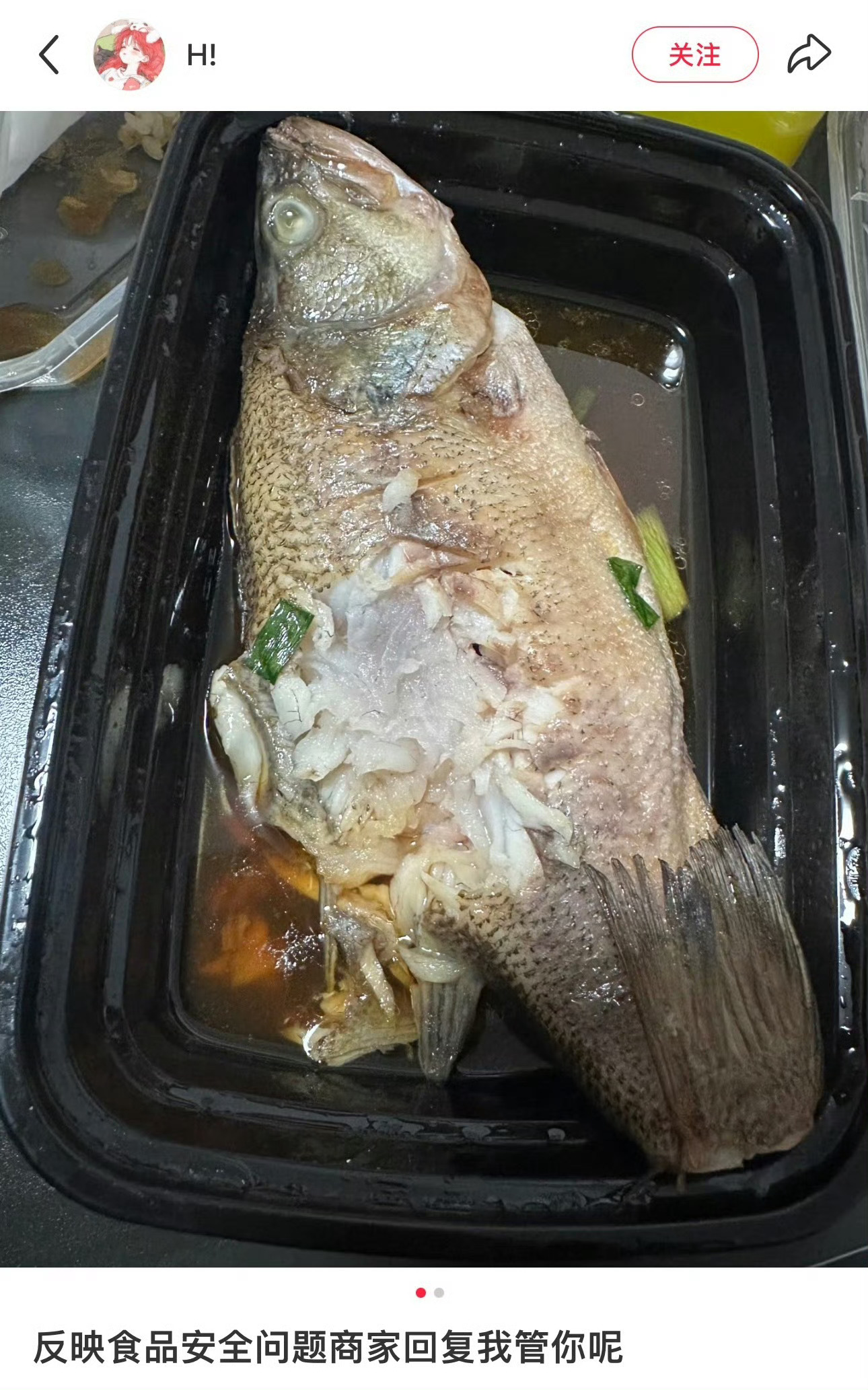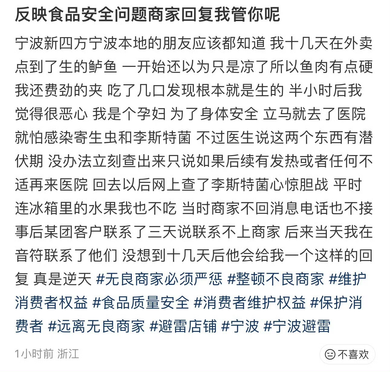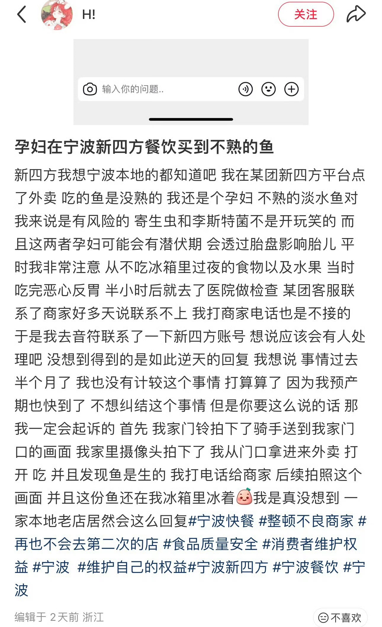 宁波孕妇新四方买到不熟的鱼商家回复我管你呢 网友“H!”发帖投诉:在某团点外卖买了新四方快餐,本人孕妇,结果发现外卖来的鱼没有熟。在得不到妥善解决后,私信客服,对方回复:我管你呢…
