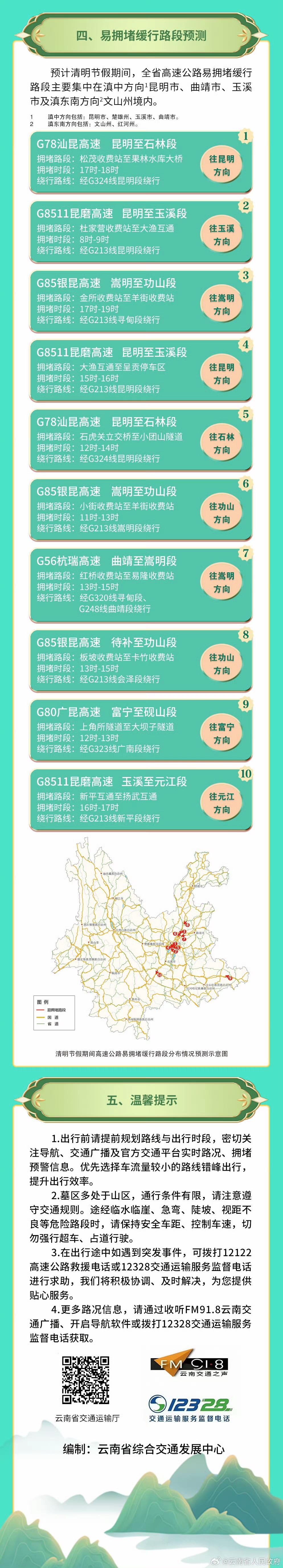 📍 清明节假期打算去云南游玩的朋友们可要留意啦! 近日,云南省交通运输厅发布了2026年清明假期公路网出行服务指南。清明期间,云南部分路段易出现拥堵状况。若不提前做好规划,堵在路上可就太糟心了。 之前假期出游,没提前了解路况,结果堵了好几个小时,大好的假期时光全耗在路上了。所以出行前一定要提前了解交通状况和天气变化。可通过交通部门的官方渠道、地图软件等掌握实时路况,合理规划路线和时间,如此方能拥有一个愉快的假期! 云南游玩顺序 清明公路大塞车 交通出行 清明节