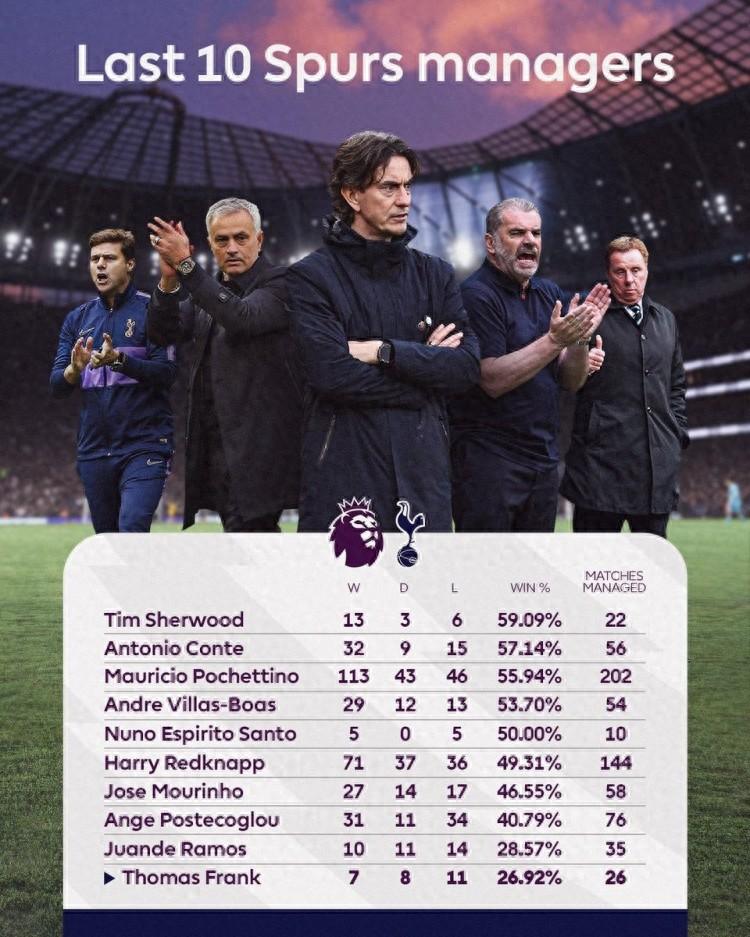热刺太“热”了,“欲火焚身”了都。 图多尔,拉齐奥、尤文图斯的前主帅,本来是被请来的“救火英雄”, 然而,事与愿违, 图多尔直接“火上浇油”了。 2月14日上任至今44天,带队成绩是1胜1平5负。 联赛更是延续13轮不胜,积分仅比降级区的西汉姆联多1分,保级警报声,响得是撕心裂肺。 据说,图多尔都没好意思索取下课的补偿金。 都这样了,还要啥自行车啊。 上赛季获得欧联杯冠军之后,热刺在高光之后,似乎陷入了“盛极必衰”的魔咒。 夺冠也不是免死金牌。 2025年6月热刺俱乐部宣布,打破17年冠军荒之后的波斯特科格鲁,将不再出任球队主帅。11胜5平22负积38分,20支球队中排名倒数第四。他必须为这样惨淡的联赛成绩负责。 热刺在官网发布的声明中表示,波斯特科格鲁作为热刺历史上第三个带队收获欧战奖杯的主帅,将被牢记。但董事会一致同意,不能因为欧罗巴联赛的胜利在做决定时感情用事。相信通过换帅能让球队在下一个赛季乃至将来获得更大机会。 然而,踌躇满志的托马斯·弗兰克,让董事会大失所望,带队成绩竟然是26场7胜8平11负,胜率26.92%,还不如波斯特科格鲁呢,甚至在历任十名主帅中,胜率排名垫底。 更耐人寻味的是,热刺主帅弗兰克,竟然端着一个印有阿森纳标志的杯子,在赛场边晃荡。 哪怕阿森纳是儿时的梦想,弗兰克的这一做法,也会让热刺球迷出离愤怒吧。 更无厘头的是, 面对不堪的战绩,弗兰克在2月12日凌晨赛后发布会上,表示自己不会被解雇。 球队是否成功,绝不仅仅取决于主教练、老板、董事、球员或工作人员,而是取决于所有人。1000%确信自己是热刺正确人选。 当天晚上,热刺官方宣布弗兰克下课。 我喜欢挑战自己,我很幸运之前从未被解雇过的弗兰克,上任8个月后第一次尝到了被解雇的滋味。 很奇怪,作为职业教练的弗兰克,这种盲目自恋,是从哪里来的如此底气。 从波斯特科格鲁、弗兰克,到图多尔,热刺董事会心怀大志,却屡战屡败。 或许,波斯特科格鲁将球队戴上了一个不该有的历史高度,耗尽了多年了辛辛苦苦积攒的好运、口碑之后,又开始了一个新的重建周期。 球队成绩下滑的原因,用弗兰克的话说是取决于所有人,而用葛优的总结,则是更精辟: 人心散了,队伍就不好带了。 知名解说詹俊发文表示,热刺现在的难题,就是找谁执教剩余的7场比赛。他认为莱恩-梅森很适合这个”救火教练“。热刺解雇孔蒂、穆里尼奥时,助理教练莱恩-梅森都曾担任临时主帅。 事实上,无论是深耕英超多年、擅长保级救火的肖恩・戴奇,还是前马赛主帅德尔泽比,或者是前摩纳哥主帅许特尔,能否完成聚拢人心、七轮之后保级成功的重大任务,恐怕有些强人所难。 换句话说, 热刺保级,或许难于上青天。 毕竟,此时此刻,努诺的铁锤帮,士气正盛。 去年十月,热刺宣布帕拉蒂奇、约翰-兰格共同担任体育总监,罕见的双总监制在英超引发广泛讨论。 主帅暂缺,不如让两位总监兼职,渡过难关,也未尝不可吧。 毕竟, 球队缺乏的不是战术, 而是士气。