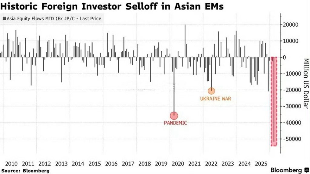 外资正以创纪录的速度抛售亚洲股市:截至3月目前,海外投资者已净卖出520亿美元的亚洲新兴经济体股票(不含A股),创下有记录以来的最大单月资金流出规模。这一数字较2020年疫情期间创下的此前单月最高纪录高出49%,较2022年6月俄乌冲突期间的资金流出规模更是高出148%。