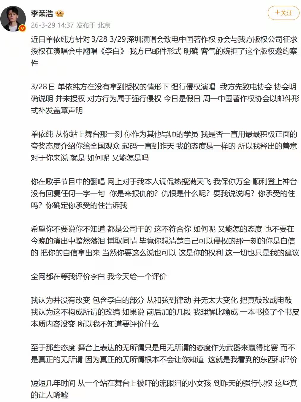 单依纯侵权就是自己的责任,拿啥团队背锅 支持李荣浩的大度不要版权费[赞][赞][赞] 李荣浩也说了别扯那些没用的 这个单真不善[灵光一闪] 曾经的单纯真不纯[捂脸] 现在变得欲女不忍直视 现在年轻人就喜欢这样的 我老了不懂 但游戏规则还是要遵守 做人要讲道德品质 否则不配[捂脸][捂脸][捂脸]