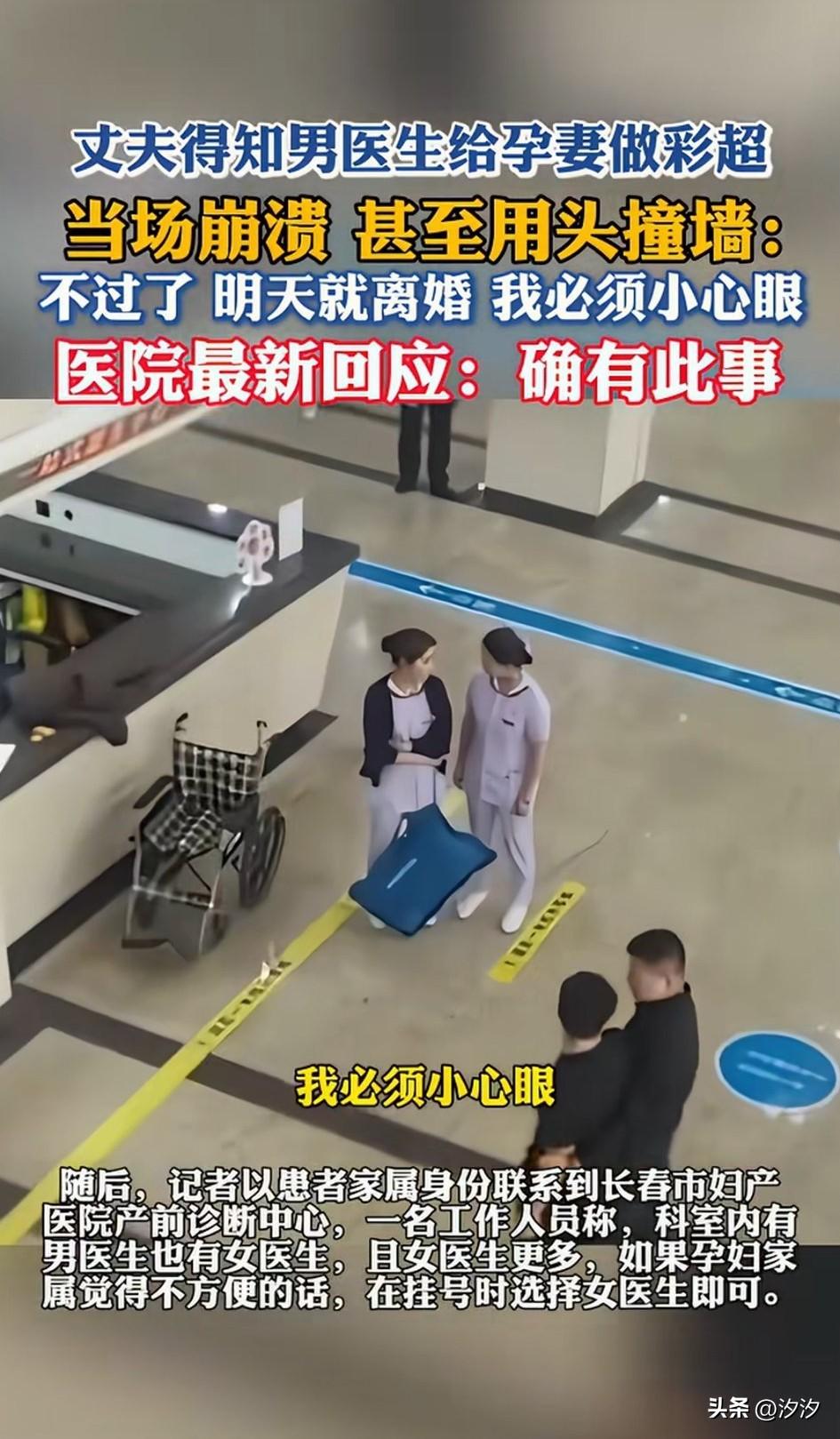 吉林长春妇幼医院大厅出事儿了, 一个男子崩溃大哭, 吵着要和自己的妻子离婚, 还想用头撞医院的墙壁, 幸亏被旁边的工作人员拦下了, 原来这天他陪着自己的妻子孕检, 没有想到自己的妻子居然被医生看光了,给妻子做彩超的居然是男医生, 男子得知之后直接崩溃大哭, 这才出现了医院大厅的一幕, 之后医院安排人员给男子做了心理辅导,这才将男子的情绪稳定下来, 记者也采访了当地的医院, 医院表示医院有男医生和女医生, 就诊的时候可以自由选择, 而且女医生的数量多于男医生, 很多人都遇到过这样的问题, 上号的时候没有人告诉性别, 直到进了检查室才知道, 真的非常的尴尬, 尤其是女生, 肯定不希望男医生接触自己的身体, 虽然医生见过的人很多, 在他们眼中都是病人, 但是病人的感觉是不一样的, 这就叫做尊重女性, 医院应该主动提醒患者, 问患者是选男医生还是女医生? 这样才是有服务,有温度的医院, 而不是让患者自行选择, 很多人根本就不了解这一块, 大家觉得男医生给女生做孕检合适吗? 长春身边事 长春孕检 保健妇幼