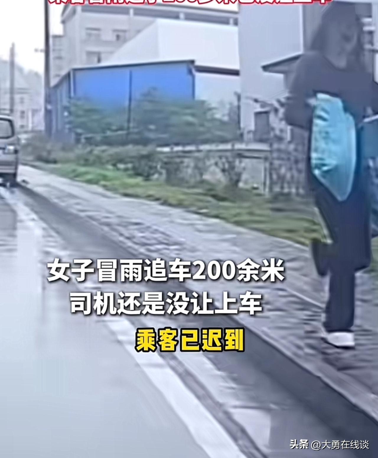 乘客打车迟到,司机在看到乘客后,故意将车辆开走,保证乘客看到打的车辆在眼前走过而且不停车,司机又始终保持让人追上追不上的距离,天空又在下雨,一直追了200米司机都没让上车!