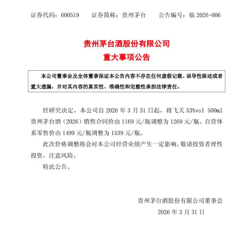 超级重磅:飞天茅台调整出厂价和零售价,分别涨100元、40元 3月30日晚,贵州茅台发布公告称:自2026年3月31日起,将飞天53%vol 500ml贵州茅台酒(2026)销售合同价由1169元/瓶调整为1269元/瓶、自营体系零售价由1499元/瓶调整为1539元/瓶。2026年1月14日,贵州茅台公告的《2026 年贵州茅台酒市场化运营方案》显示,将以市场为导向,构建“随行就市、相对平稳”的自营体系零售价格动态调整机制。对经销模式,将根据不同产品、 不同渠道的经营成本、 经营难度、经营风险、 服务能力等, 科学合理测算确定相应的销售合同价并动态调整。据悉,本次调整是贵州茅台继年初对精品茅台、生肖茅台、陈年茅台(15)等多款产品的自营体系零售价下调后,对产品价格作出的又一次重要调整。