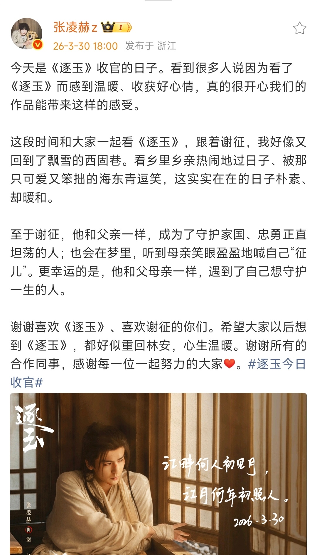 张凌赫逐玉收官文张凌赫逐玉收官长文张凌赫逐玉收官长文,虽然这部剧有争议但也收获了很多夸奖,谢谢张凌赫带来的谢征,真的很喜欢