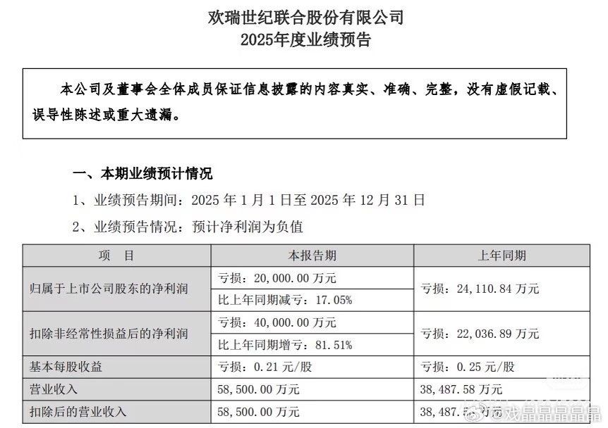 欢瑞世纪出2025年报预披露了,亏损2亿元左右,看了一下欢瑞小程序,一哥还是成毅