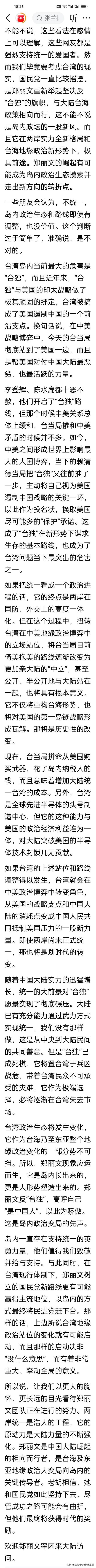 太中肯!一小时前,胡锡进发文拆解网友对郑丽文的争议,道破两岸关键! 胡锡进这篇长文分析彻底解开大家对郑丽文的争议疑惑!不偏激、不贴标签,反而把岛内政治逻辑扒得透透的,我认为分析得非常客观。 老胡讲了三个核心观点: 1. 不将郑丽文与民进党混为一谈,认可其“反独”立场。 2. 点出当前台湾最大风险是“台独”与美国深度绑定,沦为美国遏华前沿,这才是两岸问题的关键症结。 3. 老胡认为郑丽文的崛起是岛内地缘政治变化的产物,其路线若调整,或能推动台湾在中美博弈中转变立场,甚至瓦解美第一岛链布局。 今天,胡锡进跳出情绪站队,用大局观剖析两岸问题,两岸统一是大势,岛内合理声音终会被时代接纳。