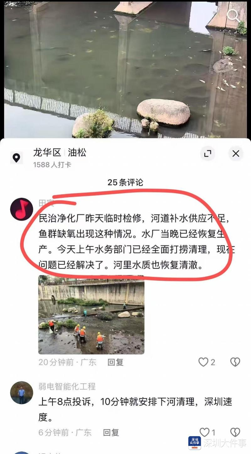 针对市民提出的 “雨天偷排污水” 质疑,龙华区水务局回应称,死鱼系民治水质净化厂停产检修致补水减少、鱼类缺氧死亡,且当日水质监测显示水质达标,目前河道水况已恢复正常。南都N视频记者 陈文才