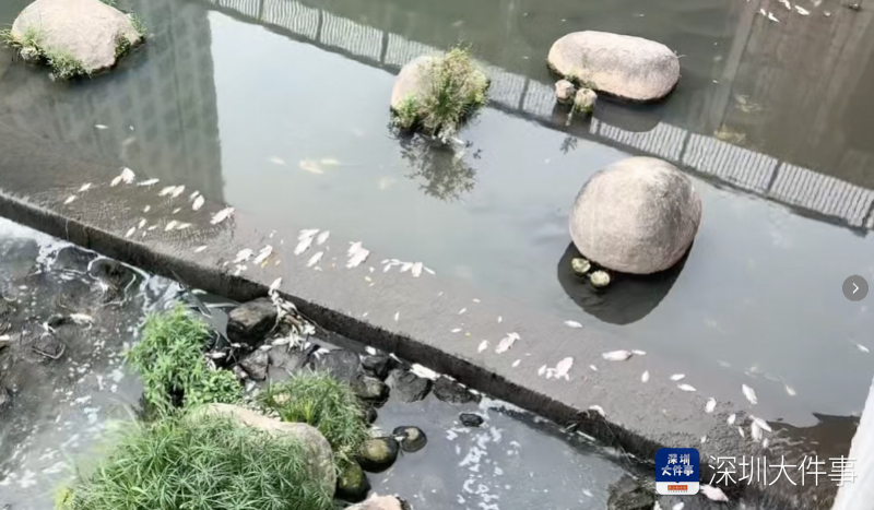 事发次日,南都记者走访现场发现仍有死鱼从上游冲下,亦有网友称下游的观澜河也发现死鱼。