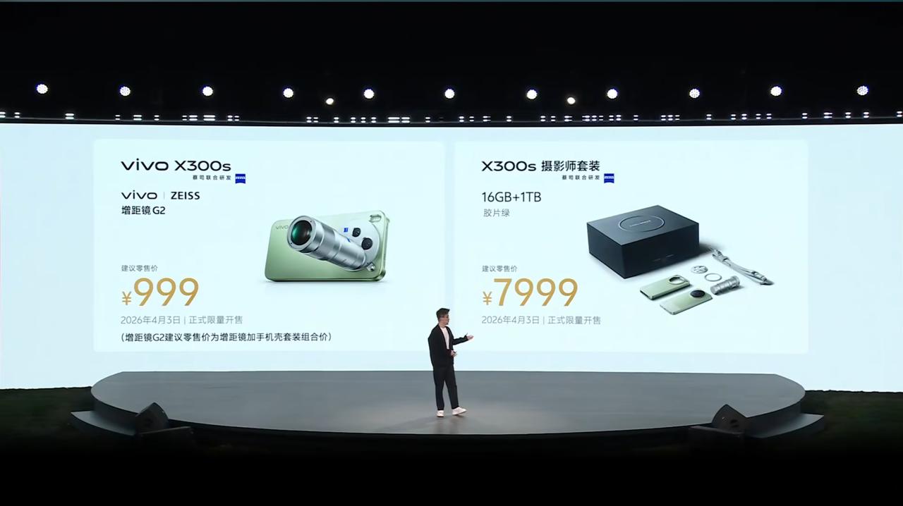 vivo X300s 正式发布,12GB+256GB 售价 4999 元、12+512GB 售价 5499 元、16GB+512GB 售价 5999 元、16GB+1TB 售价 6999 元,增距镜 G2 售价 999 元(限量),X300s 摄影师套装 16GB+1TB 胶片绿售价 7999 元(限量)。 - 芯片:首发联发科天玑 9500 移动处理平台,LPDDR5X 内存,UFS 4.0 闪存,冰脉流体 VC,蓝图影像芯片 V3+,新增 iQOO 同款 Monster 超核引擎; - 屏幕:6.78 英寸 2640×1216 OLED 直屏,京东方 Q10 Plus 发光材料,全局峰值亮度 2000nits,局部峰值亮度 4500nits,硬件1nit 低亮,支持 144Hz 刷新率,8T LTPO,2160Hz 高频 PWM 调光+全亮度类 DC 调光,全链路蔡司自然色彩,圆偏振光护眼 2.0; - 相机:前置 50MP(三星 S5KJN1,1/2.76"),后置 200MP 主摄(三星 S5KHPB,1/1.4",OIS,CIPA 4.5 级防抖)+50MP 超广角(三星 S5KJN1,1/2.76")+50MP 潜望长焦(索尼 LYTIA 602,1/1.95",OIS,CIPA 4.5 级防抖)三摄,蔡司 T* 光学镜头,全焦段变焦闪光灯,新增蓝图调色盘,「追光」、「浓郁」两种色彩风格; - 续航:7100mAh 蓝海电池,支持 90W 快充,40W 无线充电,支持全局直驱供电 2.0、微电精灵 2.0; - 其他:厚 8mm,重 217g,胶片绿、梦核紫、银白、钛黑 4 款配色,云锻砂玻璃后盖,NFC、红外遥控、USB 3.2(5Gbps)、战鼓大师对称双扬 Pro(双 1115)、寰宇信号放大系统 3.0、超声波指纹识别 2.0,支持 IP68 & IP69 防尘防水,定制 7514 超感振动马达,公里级无网通信,OriginOS 6 系统。