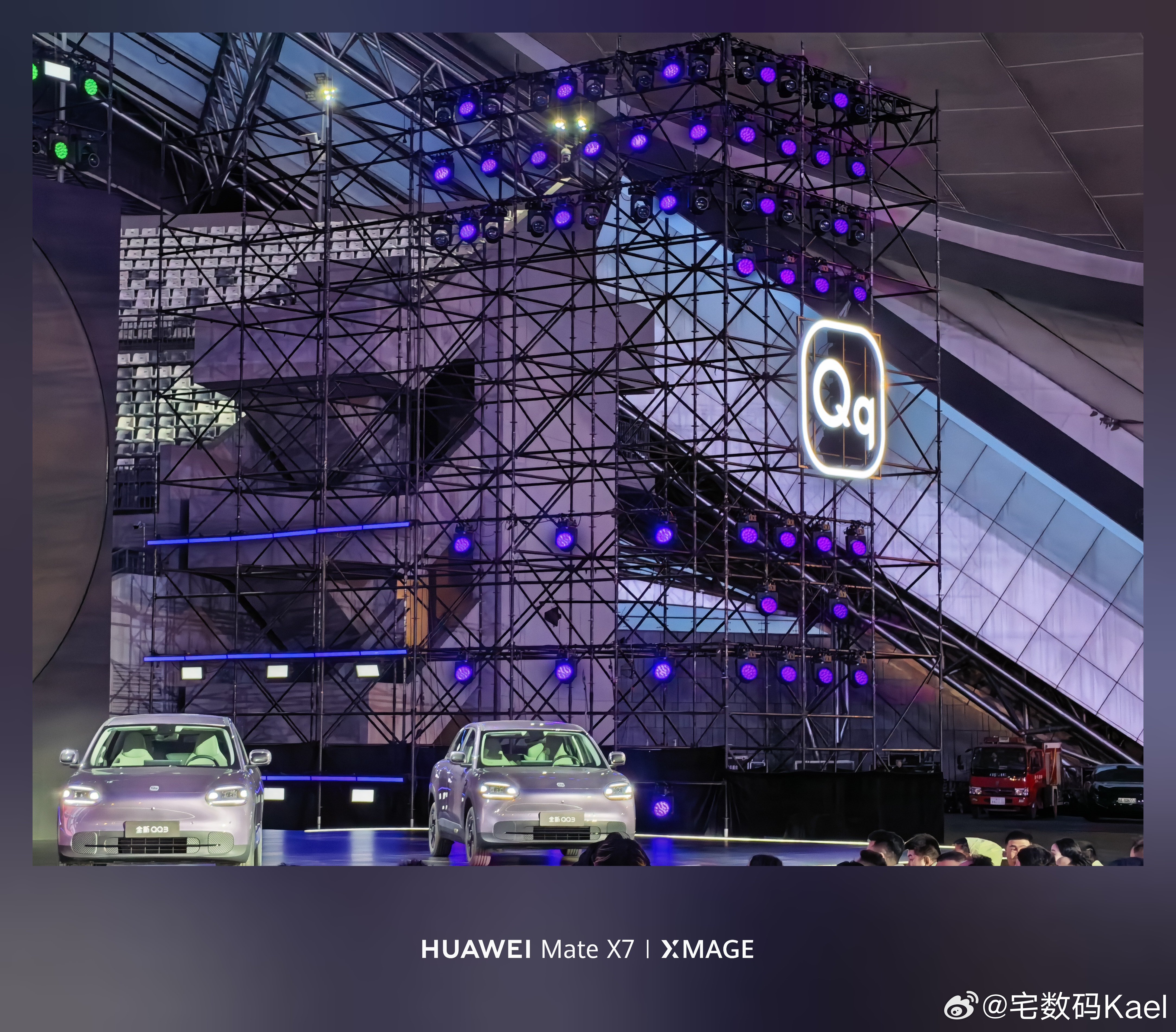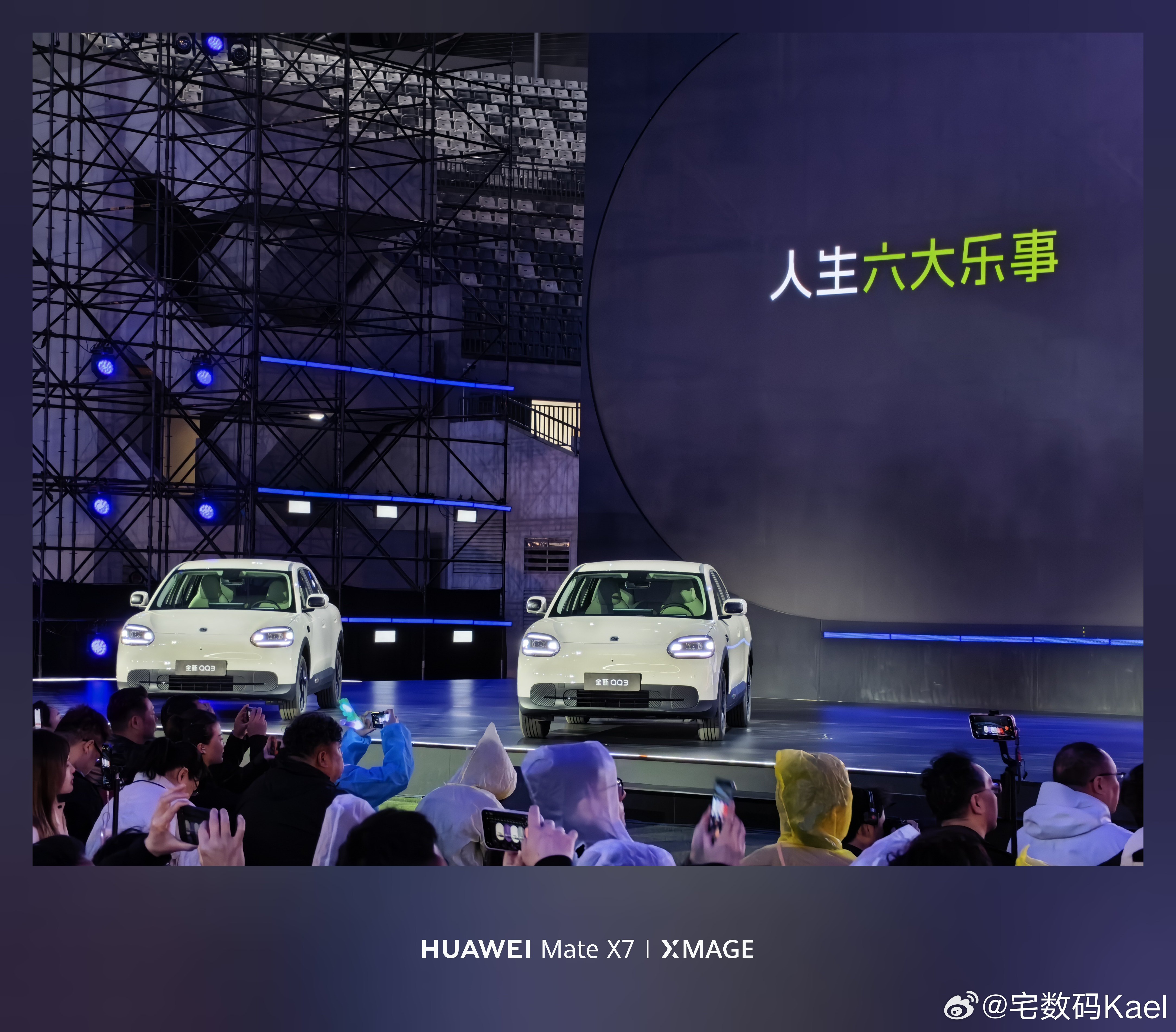 来参加奇瑞的全新QQ3上市发布会啦!小车车很可爱,就是成都今晚下雨,露天会场有点
