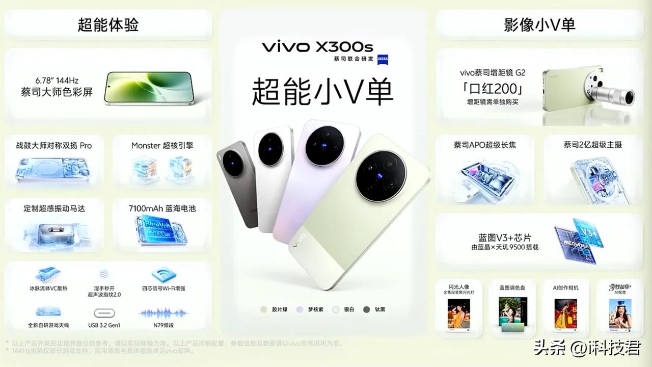 X300s超能小V单vivo X300价格 12+256GB 4999;国补4499 12+512GB 5499;国补4999 16+512GB 5999;国补5499 16+1T 6999 G2增距镜999元 X300s摄影师套装7999元 联发科天玑9500芯片 7100毫安时蓝海电池 90W有线充电+40W无线充电 6.78英寸144hz蔡司大师色彩屏 iQOO同款monster超核引擎 IP68+IP69级防尘防水 蔡司2亿主摄+蔡司APO长焦 蓝图影像V3+ 第二代全焦段变焦闪光灯