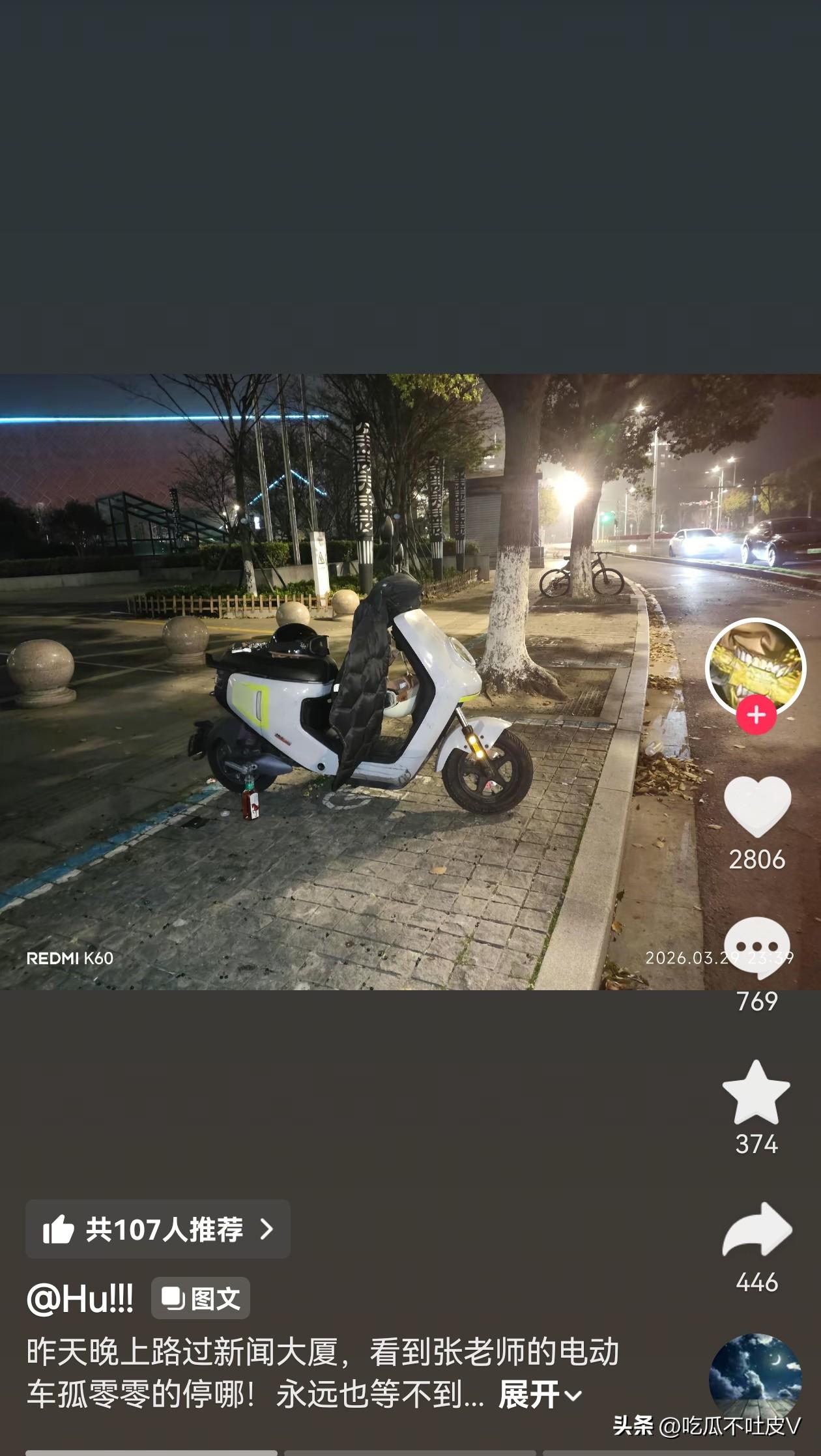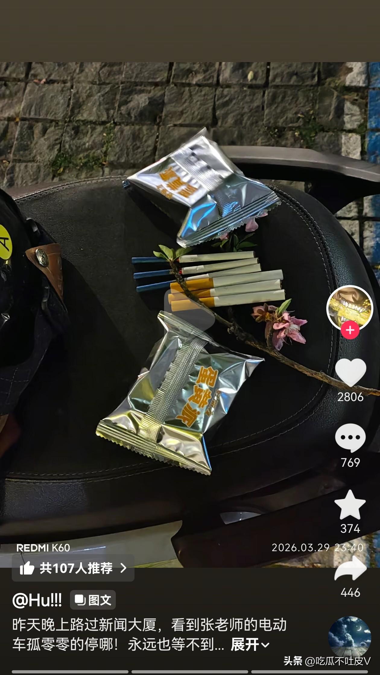 有苏州当地的网友路过新闻大厦 看到张老师的电动车孤零零地 还停在路边,电动车上还有两个安全头盔,估计有网友认出来了,在电动车摆放了香烟和蛋黄派还有几颗花瓣,看起来十分冷清,估计现在他们家和公司已经乱成一团了,肯定是没人来关注这辆电动车了,还要在路边停一段时间。 苏州的网友是真厉害啊!连张老师骑的电动车都认识,这得经常遇到才能记住吧!