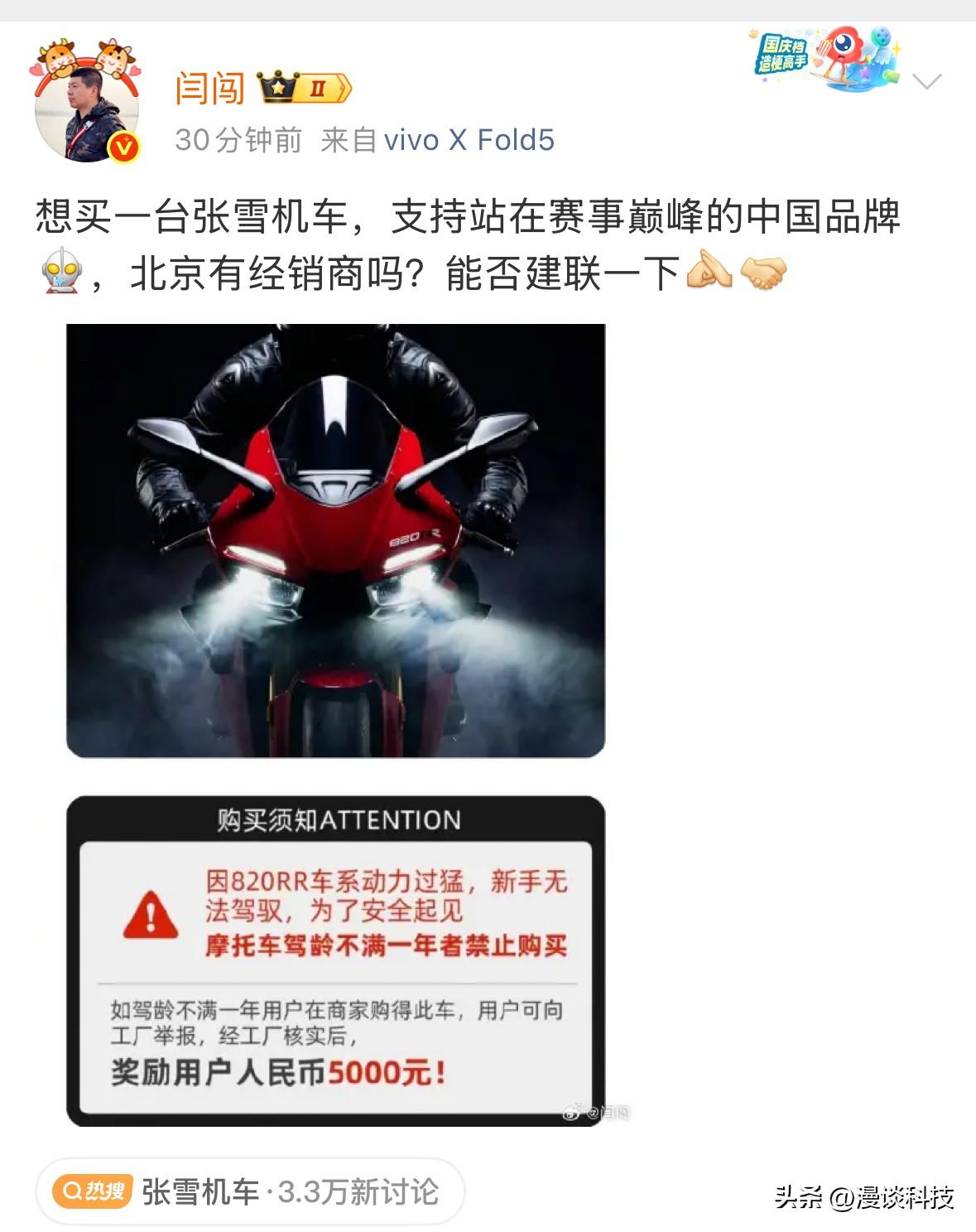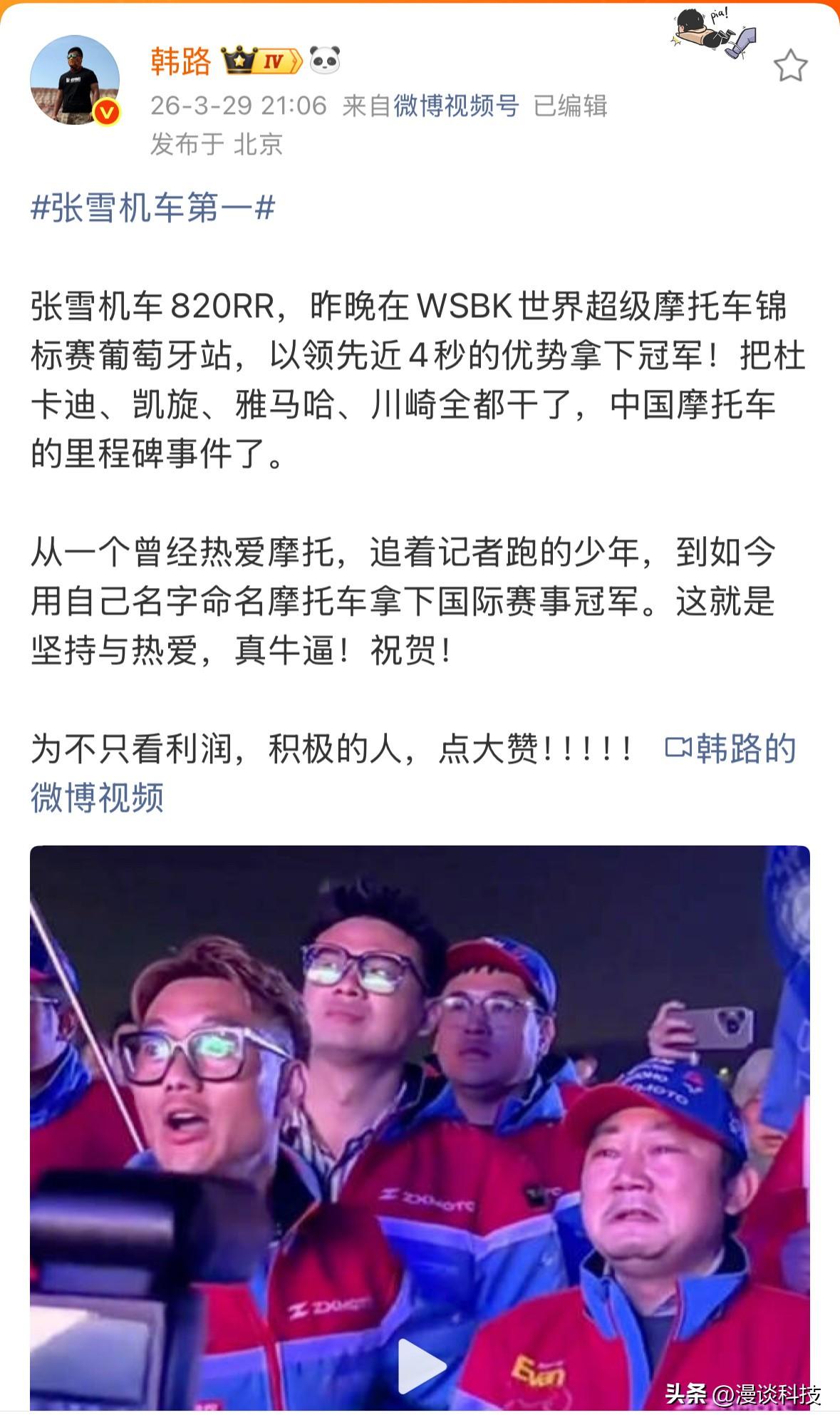 车评人都来给张雪机车点赞了,韩路表示张雪是坚持与热爱,为不只看利润、积极的人点大赞,闫闯直接发文表示要买一台张雪机车。 张雪的故事太励志了,笔者也是深受感染,有梦想谁都了不起,必须为执着追梦、永不言弃的人点赞。