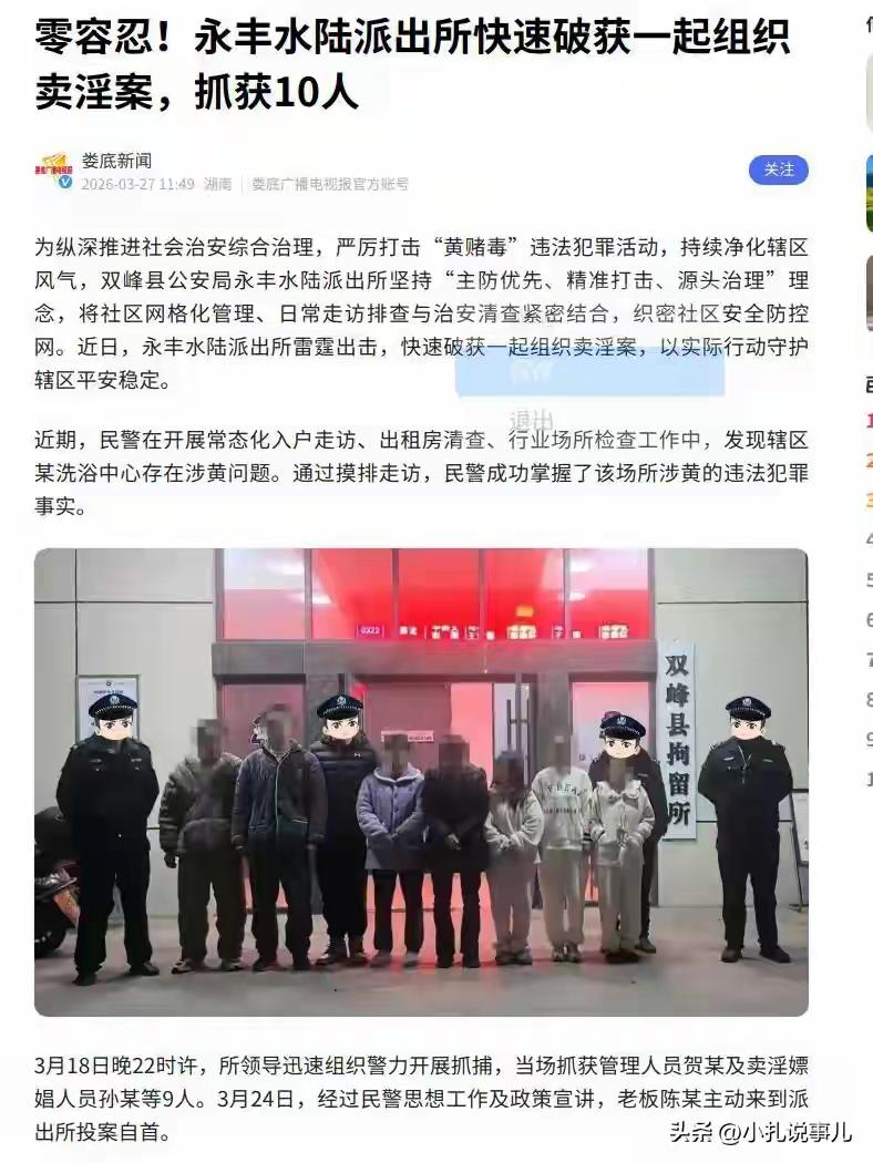 湖南双峰“养生”洗浴中心暗藏淫窝被一锅端!警方深夜突袭现场画面曝光,幕后利益链竟牵出行业潜规则 夜色下的双峰县街头,一家挂着“养生水疗”招牌的洗浴中心灯火通明。谁曾想,这看似寻常的休闲场所,竟长期以按摩为幌子进行非法交易。直到警车悄然包围,刺耳的警笛划破夜空,一场精心策划的抓捕行动才揭开了这里的丑陋真相。 当民警冲进包厢时,不堪入目的场景令人震惊。衣衫不整的男女惊慌失措,用毛巾遮脸躲避镜头。警方当场控制十名涉案人员,查获大量违法证据。这家打着养生旗号的洗浴中心,实则是组织严密的卖淫窝点。 更令人细思极恐的是,该场所已非法运营多年。工作人员会以隐晦话术试探顾客,一旦发现意向便引入密室交易。许多男性顾客抱着侥幸心理踏入陷阱,却不知自己的行为早已被监控记录,成为违法证据。 为何正规场所要铤而走险?暴利诱惑是根本原因。正规按摩服务利润有限,而非法交易却能带来数倍收益。有些女性工作者在金钱诱惑下迷失自我,最终走上违法道路。这种扭曲的商业模式,折射出部分娱乐行业的畸形生态。 警方调查发现,该窝点有着严密的分工体系。老板陈某负责整体运营,贺某等管理人员负责招揽顾客和分配“技师”,形成了一条完整的黑色产业链。他们自以为手段隐蔽,却逃不过群众雪亮的眼睛和警方的天罗地网。 此案引发网友激烈讨论。有人质问“为何食品安全不能如此零容忍”,有人感慨“贫穷才是万恶之源”。这些声音背后,反映的是公众对社会乱象的深层次焦虑。扫黄打非不仅要打击表面行为,更要铲除滋生犯罪的土壤。 值得深思的是,为何此类违法场所能长期存在?监管漏洞、利益勾结、侥幸心理都是重要因素。此案的成功侦破释放出明确信号:任何违法行为终将受到法律严惩。那些还在顶风作案者,该醒醒了! 目前,陈某、贺某已被刑事拘留,八名涉案人员被行政拘留。等待他们的将是法律的严肃审判。此案也警示广大消费者:洁身自好才是真正的养生之道,任何违法交易都会付出沉重代价。 扫黄打非 社会警示 法治进行时 (来源:娄底广播电视报官方账号、永丰水陆派出所案件通报、现场执法记录影像及网络综合信息)
