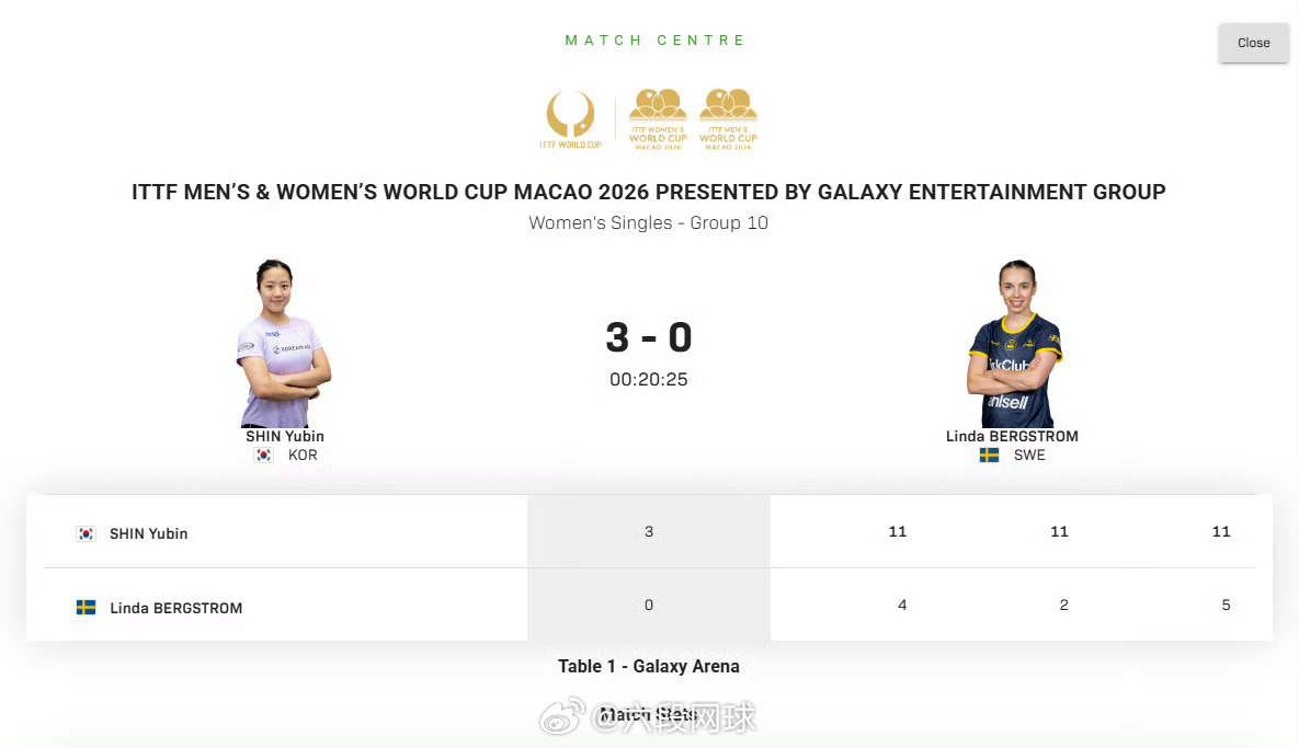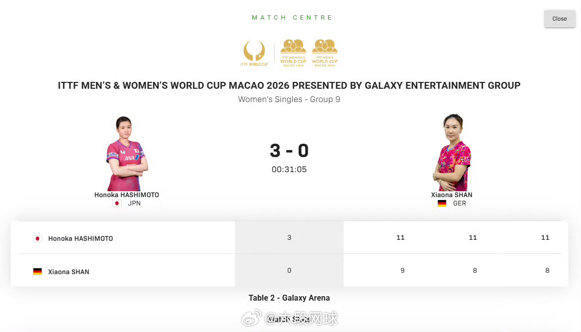 乒乓球 2026年澳门乒乓球世界杯户上隼辅3比1麦天恩 11-8/11-13/11-4/11-9 桥本帆乃香3比0单晓娜11-9/11-8/11-8 申裕斌3比0琳达 11-4/11-2/11-5 杭州