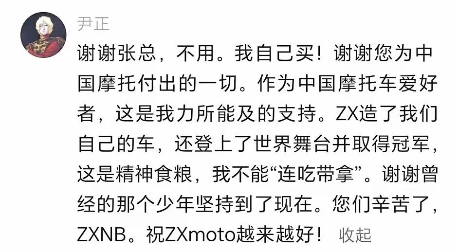 尹正对摩托是真爱啊!张雪摩托一夺冠,尹正立马要用实际行动支持。结果张雪直言说:本来该请尹正做代言人的可惜自己没钱,所以就送一辆给尹正。不管好用不好用,都发个使用说明,有则改之无则加勉。 尹正立马跟上说“这是精神粮食,不能连吃带拿”,要感谢当年那个追风少年,才让国产摩托站上世界冠军的舞台。 而这台创造历史的820RR 标准版市场价43,800元,进阶性能版为61,980元。这与那些动不动就三四十万的同赛道品牌摩托车相比,绝对是高性价比。难怪张雪笑称自己没钱,估计都把钱拿去搞研发了。 有网友也已经迫不及待地表达了支持,相信国产的力量会越来越强大,质量会越来越好。也相信张雪的人生剧本简直比《飞驰人生》更精彩。这样的励志故事难道不值得支持吗?
