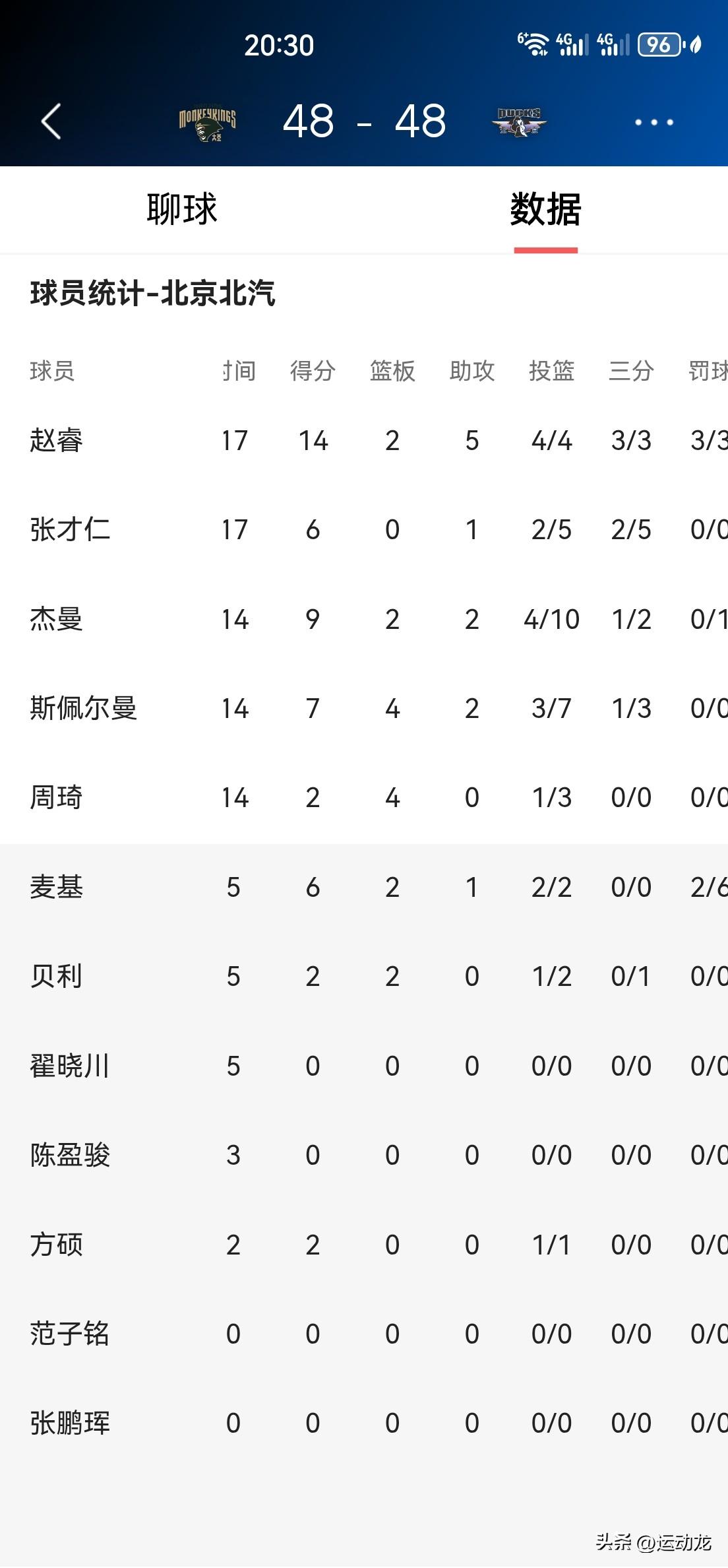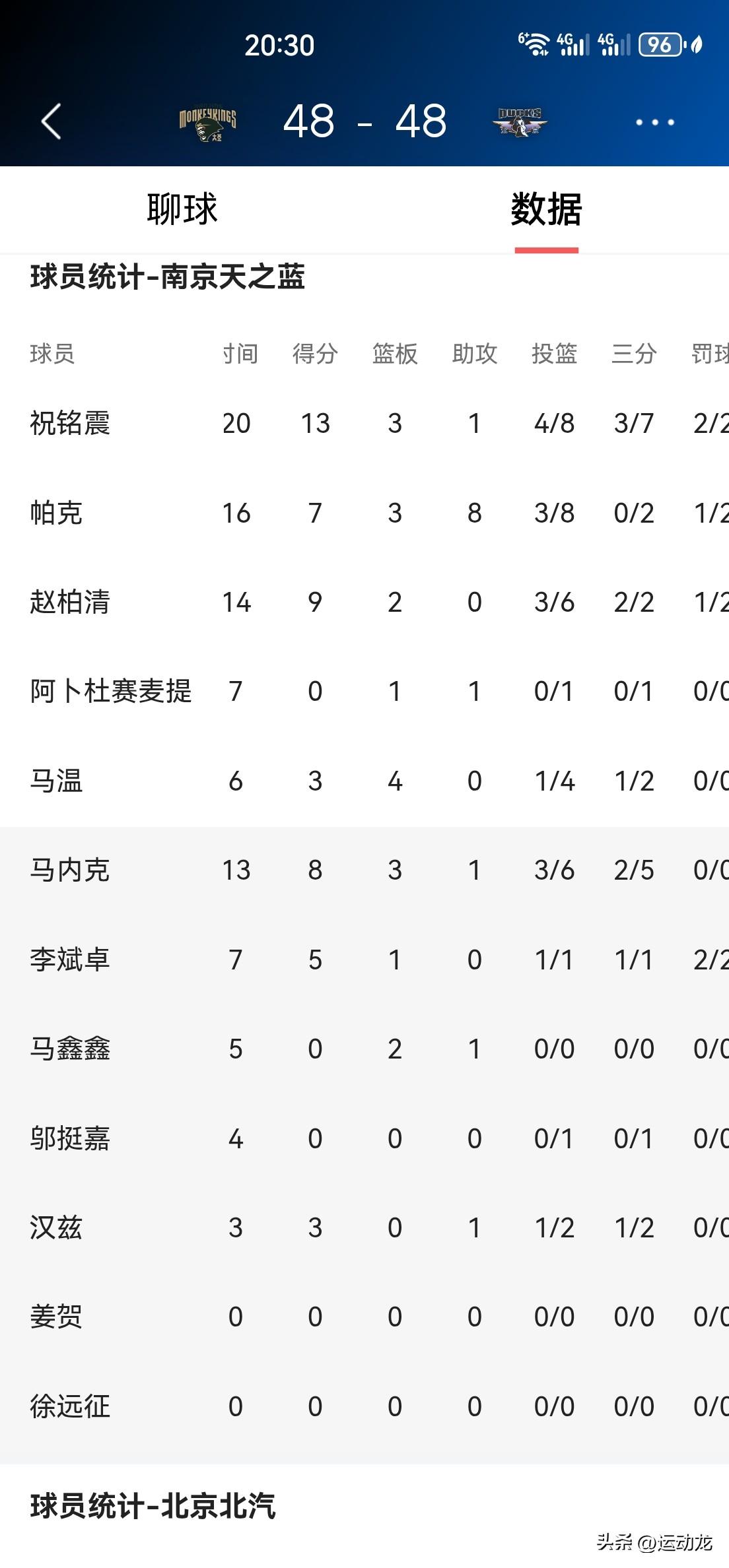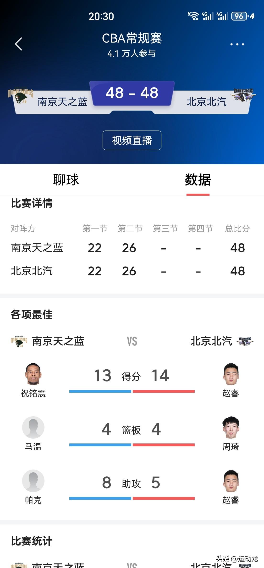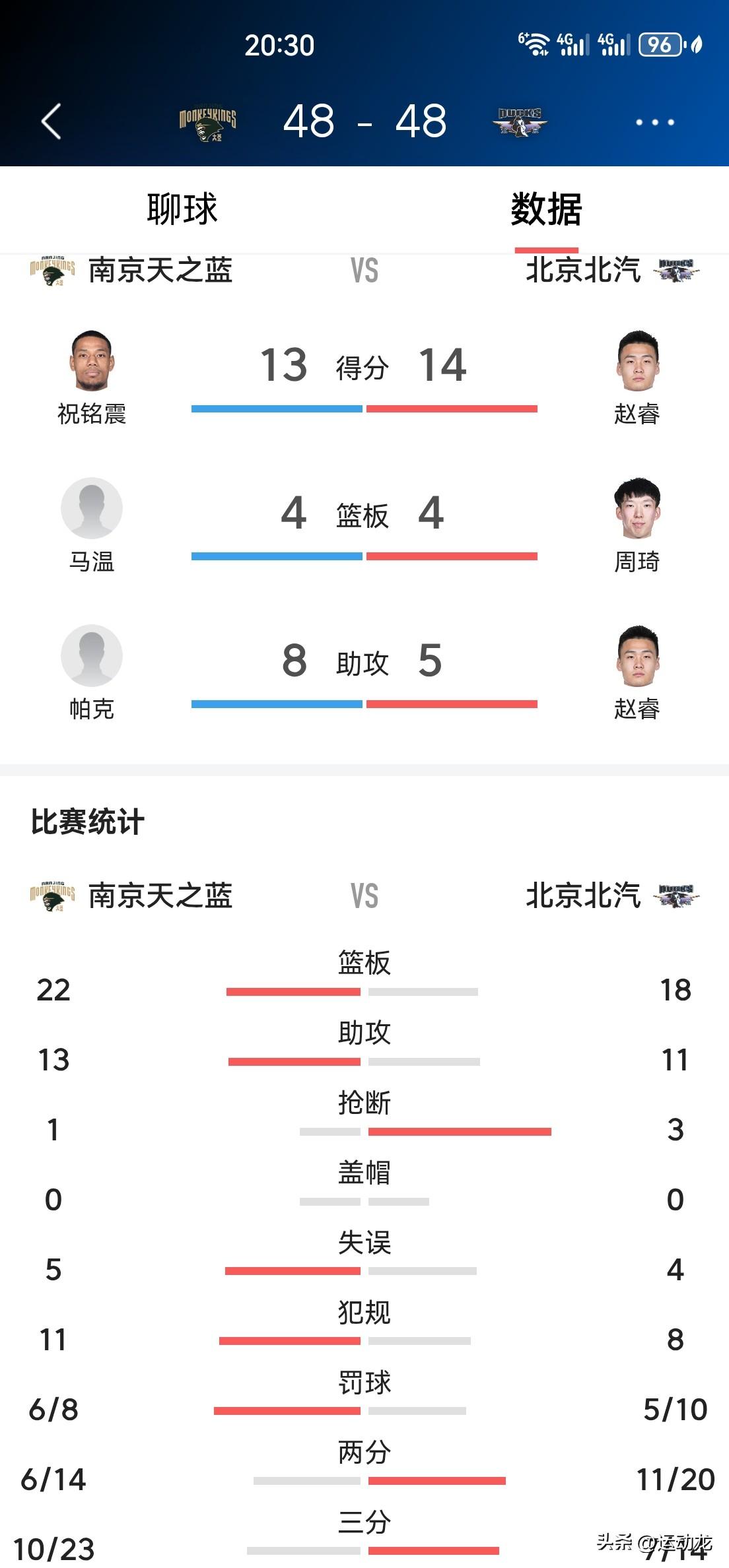 周琦半场仅得2分,北京北汽面对缺少主力得分手郭昊文的南京队,毫无优势。双方第一、第二分别打成22平和26平,半场48:48。 北京北汽队周琦出场14分钟,仅拿到2分4篮板,赵睿延续火热状态,4投4中,三分球3投3中,砍下14分2篮板5助攻,杰曼10投4中,拿到9分2篮板2助攻。 南京队郭昊文因伤缺阵,祝铭震8投4中,拿到13分3篮板1助攻,赵柏清6投3中,拿下9分2篮板。