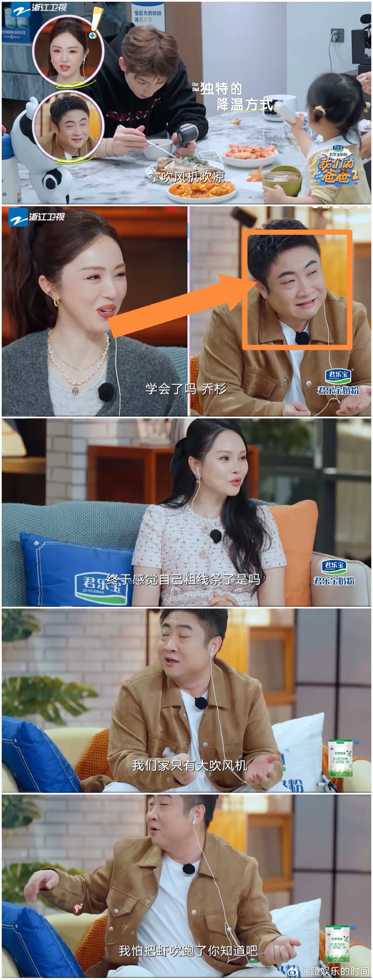 董璇,伊能静突然跟乔杉这样说,乔杉完全不买账,一脸嫌弃,但幽默化解。董璇,伊能静眼看节目里的年轻奶爸为了让鱼快点凉,让宝贝女儿吃到。于是这个奶爸就手拿小吹飞机给鱼降温。董璇,伊能静看到这一幕,就建议乔杉回去也这样给食物降温给孩子吃。乔杉听此,明显不会照做,但是他没有直接表达。看到这个奶爸的表现,乔杉也许觉得他这个操作有点“装”,一脸嫌弃,但是乔杉婉转强调“家里只有大吹风机,生怕把食物吹跑了”。哎呀,那个鱼夹出来放在一个小碗里,一下子就凉了,这个奶爸非得拿小吹风机吹。太浪费时间,而且吹风机内时间长了很容易藏污纳垢,这样还很容易污染食物。你说,拿吹风机吹凉食物,真的大可不必,董璇,伊能静就嘴上说说,自己都不会这样操作吧更何况是乔杉,他回到家大概率都是“甩手掌柜”吧
