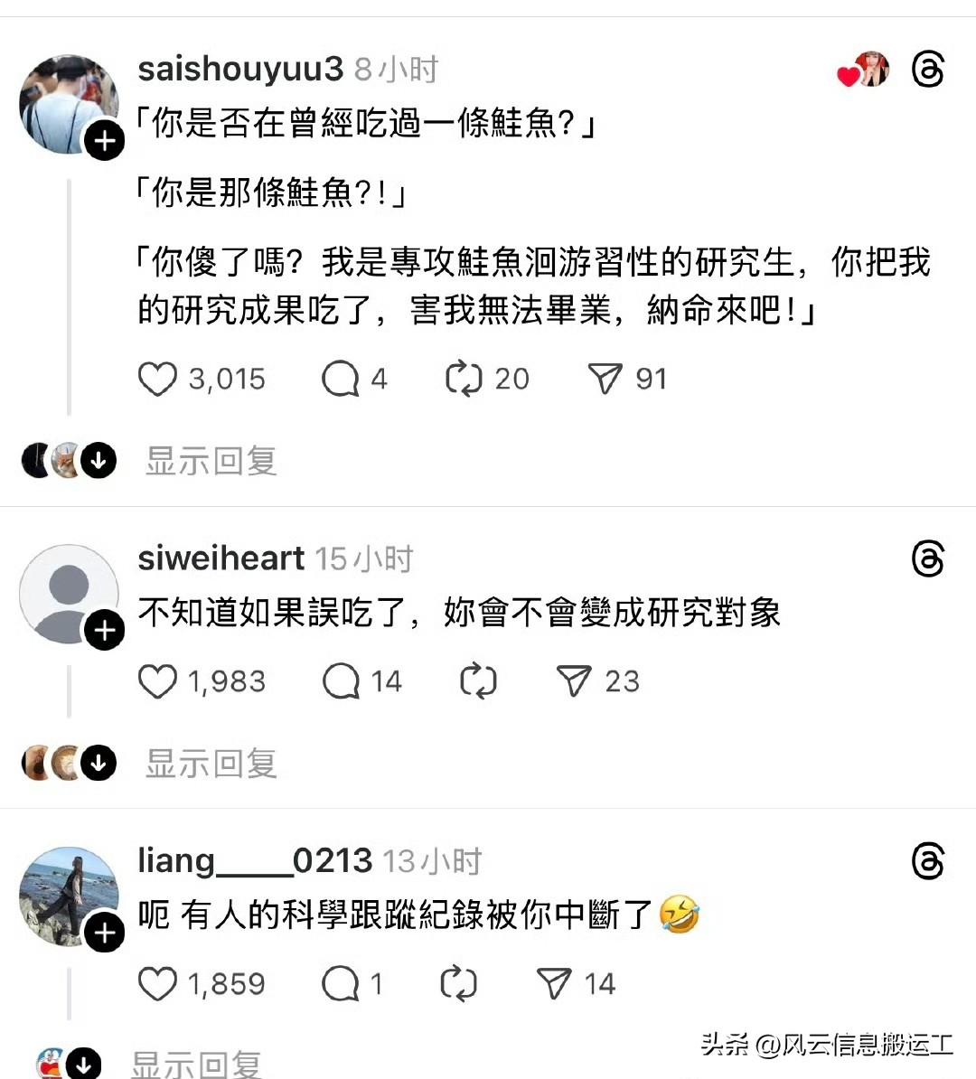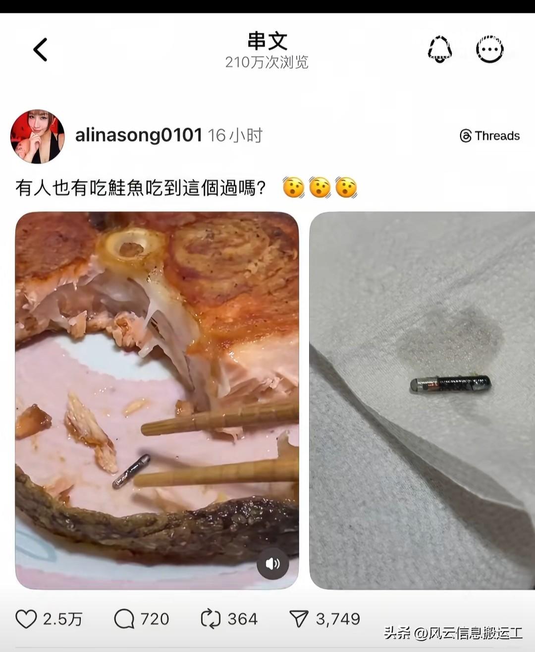 网友发帖,吃鲑鱼吃到了别人的研究生论文[呲牙](这是鱼类电子标识标签,通常也被称