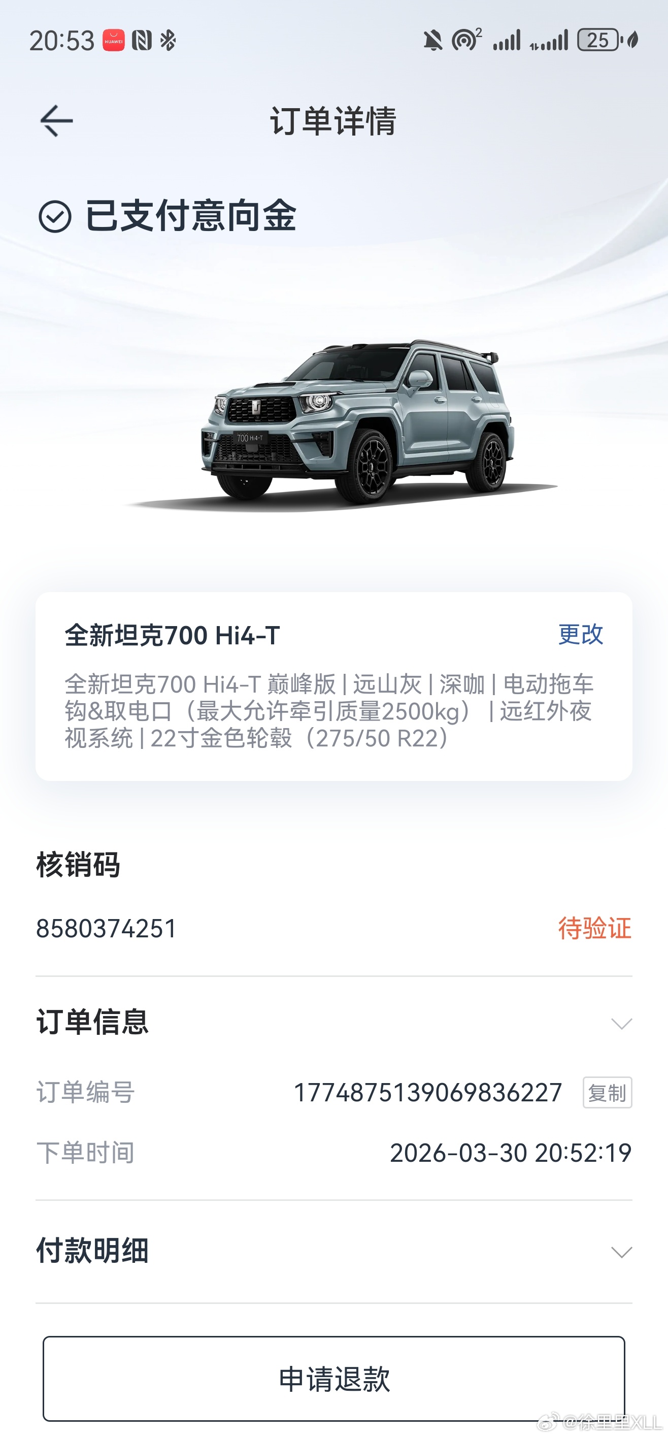 订了台全新坦克700,3.0Hi4-T版本的。