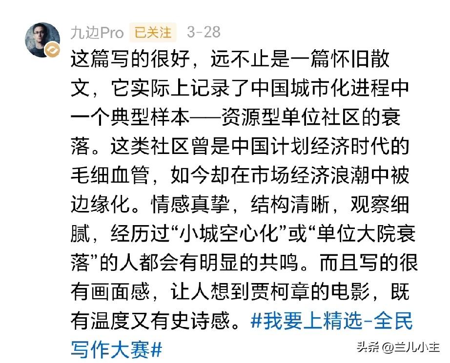 头条举办了我要上精选,全民写作大赛活动。看了九边老师的点评由衷的佩服,这篇《年味散了,油灯小区的灯,再也亮不起来了》文章有点长,但是故事主线很分明。 通过九边老师的点评,更深度挖掘了中国城市化进程,可谓是加强了理解力。点评能够让读者有迹可寻。不流于泛泛! 写生活难免流于平淡,但是平淡中的亮点作者把握的很好。这也是需要我们努力去学习的。 头条举办这样的活动,对创作者是一个鞭策,更能得到名师指点,真的是大好事,我们要积极参与,这样的机会恰是提高自己的时候。