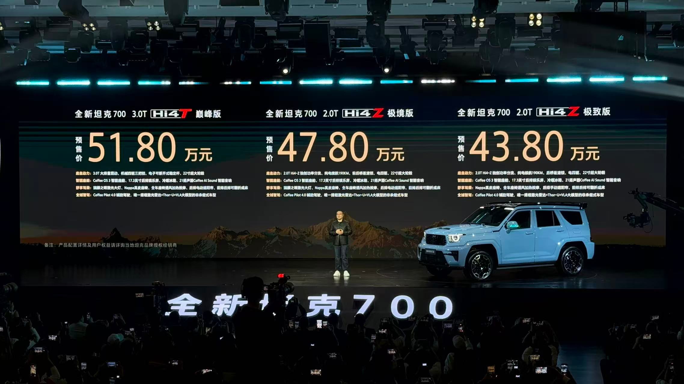 全新坦克700预售价格公布,2.0T Hi4-Z 极致版:43.80万元2.0T Hi4-Z 极境版:47.80万元3.0T Hi4-T 巅峰版:51.80万元可以说全新坦克700直接把豪华与硬核拉满,这才是越野该有的样子。现在下订可享七重大礼,权益价值至高60000元,还有总价值62000元的全系统配!不管是追求极致性能的越野玩家,还是偏爱豪华舒适的都市精英,都能在坦克700找到心动的理由。全新坦克700新时代新旗舰全新坦克700全域豪华suv新旗舰跟着魏建军看懂全新坦克700魏建军的摩登DAY全新坦克700预售43.8万元起